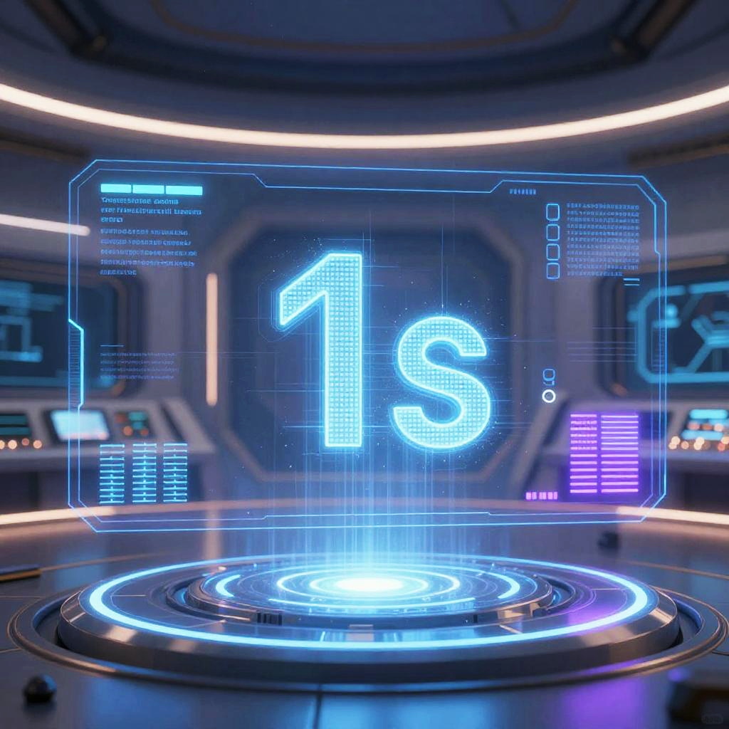 Science fiction interface showing '1s' time remaining, holographic projection with floating numerals, electric blue and purple glows, transparent futuristic HUD elements, clean lines, cyberpunk aesthetic, high-tech control room setting