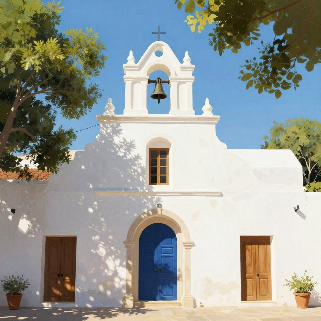This is a digital painting of a sunlit, white stucco building with a bell tower and two arched doorways. Sunbeams create dappled shadows on the building's walls. The doors, one dark blue and one wooden, are set against a bright, clear sky. Lush green trees frame the top and left sides of the image, adding a touch of nature to the serene scene.