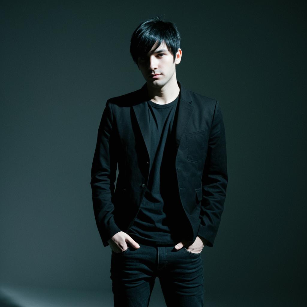 Portrait of a slim young male with short black hair wearing a black blazer over a black t-shirt and skinny black jeans. The look is minimalistic and inspired by post-punk style, set against a dark gradient background with soft lighting highlighting the subject.