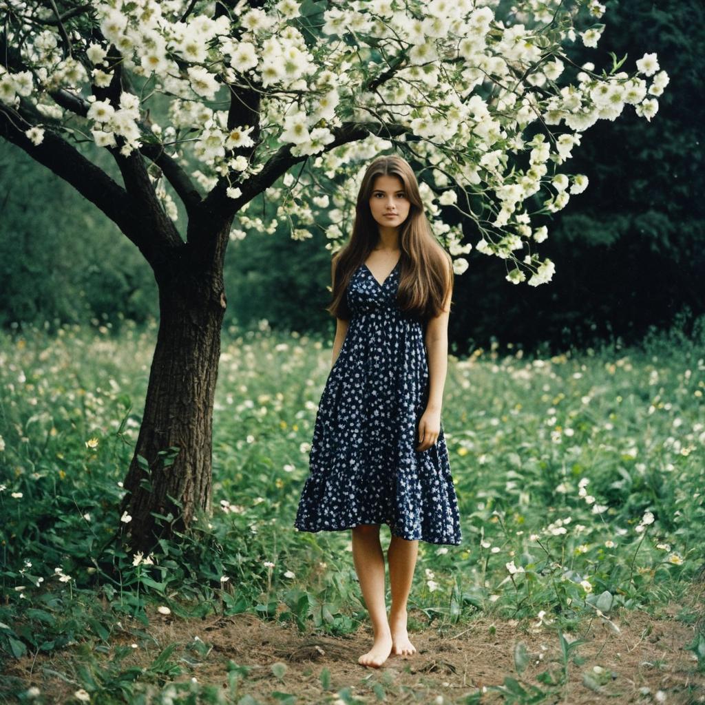 Semi classical dress,1girl, solo, dress, brown hair, long hair, flower, standing, outdoors, barefoot, tree, full body, nature