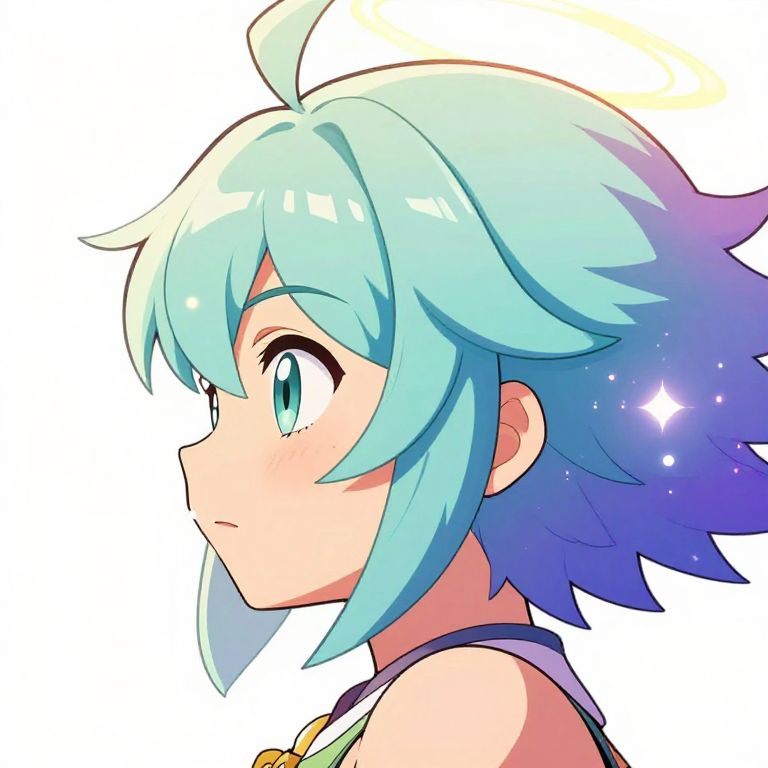 Profile picture art showcasing an anime style character with large expressive eyes, colorful hair and dynamic pose, clean linework and bright pastel colors, incorporates subtle fantasy elements like sparkling particles or ethereal halo, suitable for gaming profiles.