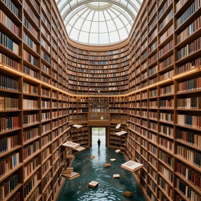 A majestic, flooded library stretches endlessly into a luminous dome, its shelves suspended above a tranquil river of books, defying gravity in a realm where knowledge floats like dreams.