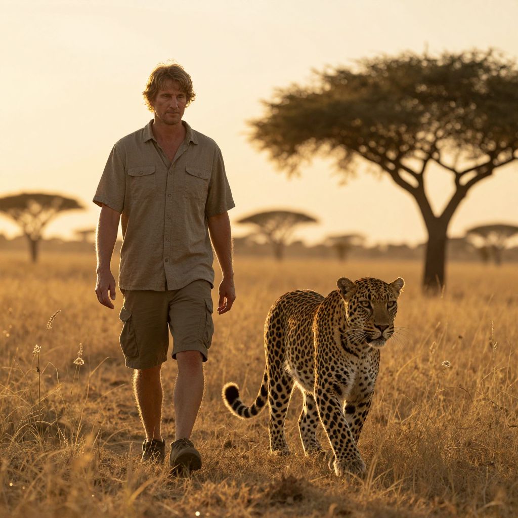 Photograph of a man in safari attire walking beside a leopard in a golden savanna at sunset, with acacia trees in the background.