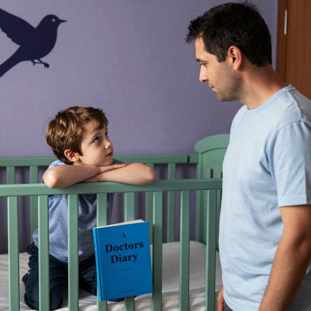 Photograph of a man and a young boy in a green crib. Man in light blue shirt stands to the right, looking down at the boy. Boy leans on crib's edge, head resting on his hand, looking at the man. Book "A Doctor's Diary" with blue cover lies on the floor. Background includes a purple wall with a bird silhouette. Man has short dark hair, boy has light brown hair. Intense expressions on boy's face.