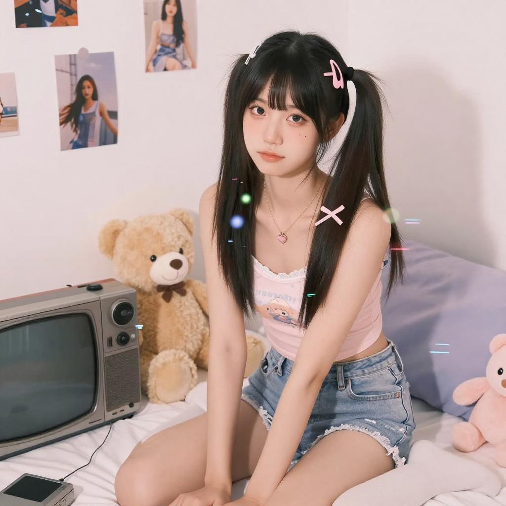 Y2K Asian girl in a cozy pastel bedroom, surrounded by old-school electronics and stuffed animals, soft lighting, subtle glitch effects, vibrant and youthful atmosphere