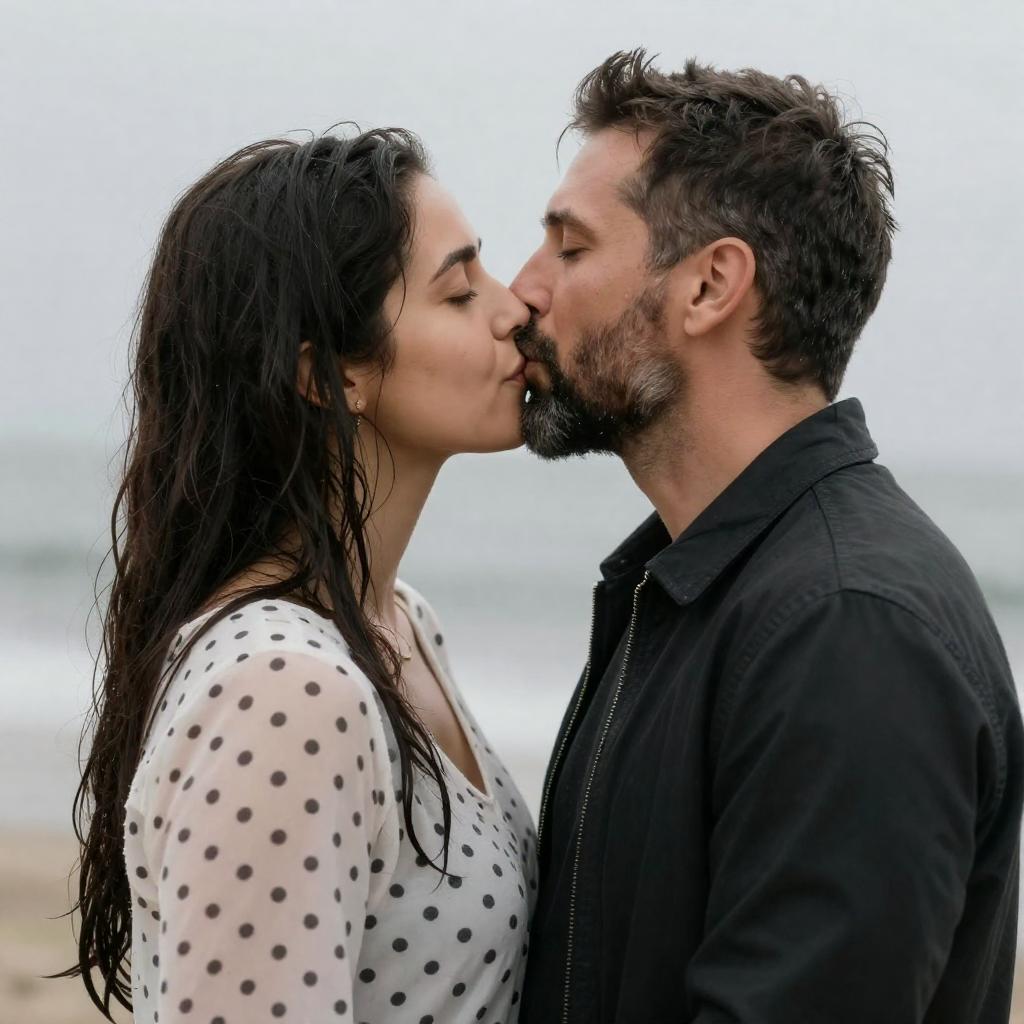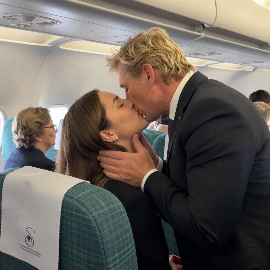 Photograph of a plane cabin. A man with blond hair and a black suit kisses a woman with brown hair. They are seated in green and white patterned seats. Other passengers, including an older woman with glasses, are visible in the background. The man's hand is on the woman's shoulder. Intense kissing.