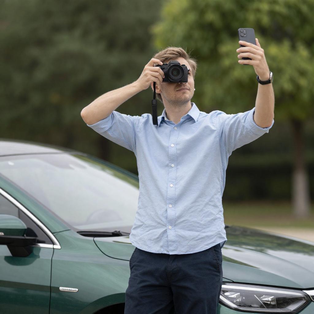 Young man with light brown hair wearing a light blue button-up shirt and dark pants stands beside a green car with an open hood. He is holding a DSLR camera with one hand raised to his eye and a smartphone in the other hand, taking a selfie. The background features green trees and a blurred outdoor setting.