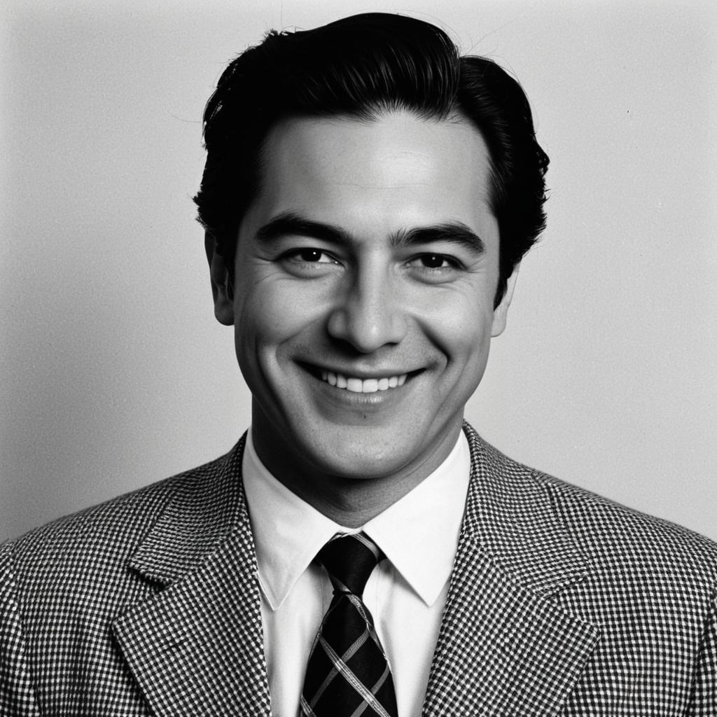 Man with dark hair, wearing a gray suit, white shirt, and red tie, holding a small black camera, smiling with eyes squinted. Black background, sunlight highlighting face. Right hand holding camera, left hand partially visible. Casual, mid-20th century style.