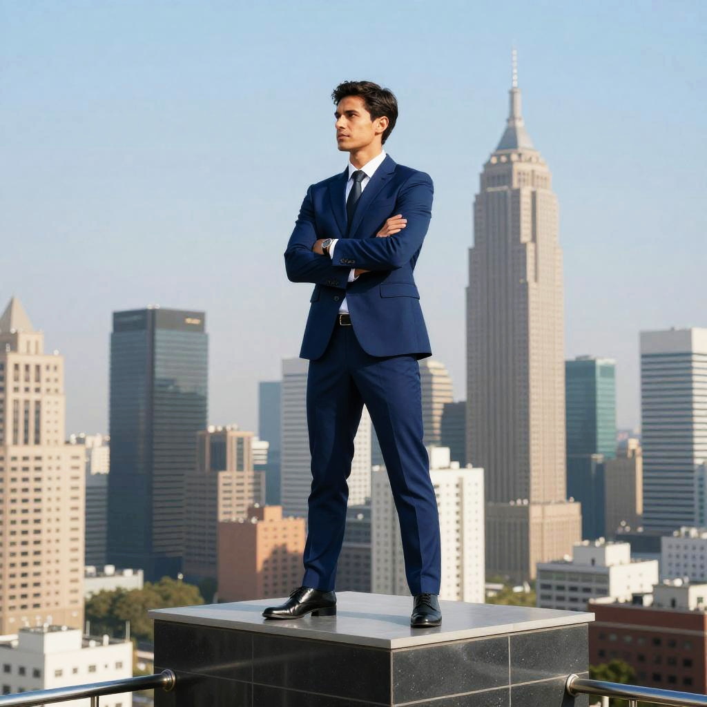 Photograph of a handsome man with medium build, short dark hair, and light skin standing confidently on a rooftop ledge, arms crossed. He wears a navy blue suit, white shirt, and black tie. The background features a clear blue sky and a cityscape with tall skyscrapers, including a prominent, beige-tinted building with a spire. He stands on a black, rectangular platform with a metallic railing. The sunlight casts soft shadows, highlighting his serious expression and formal attire. The image exudes a sense of power and accomplishment.