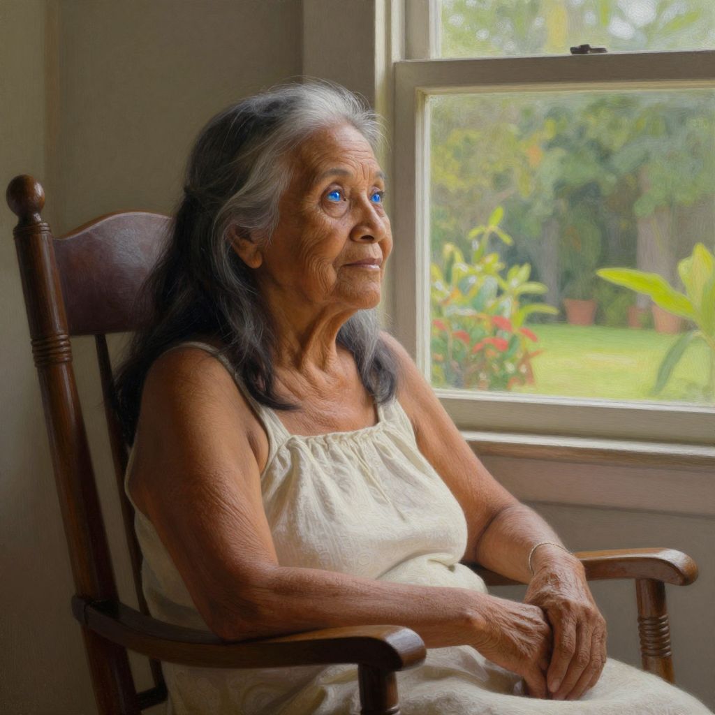 A serene portrait of an elderly Polynesian woman, her warm, weathered skin a testament to a life well-lived, captures the essence of wisdom and grace. Her striking blue eyes, a captivating contrast, reflect a lifetime of stories and experiences. Seated gracefully in a well-worn rocking chair, she rests beside a large, open window, through which soft sunlight streams, illuminating her face and gently highlighting the silver threads woven through her long, dark hair. Her thoughtful gaze is directed outward towards a tranquil garden below, the lush greenery mirroring the calm serenity that emanates from within. This digital painting masterfully blends hyperrealistic details with an enchanting softness, creating a harmonious composition that evokes a deep sense of stillness and contemplation, leaving viewers captivated by her quiet strength and beauty.