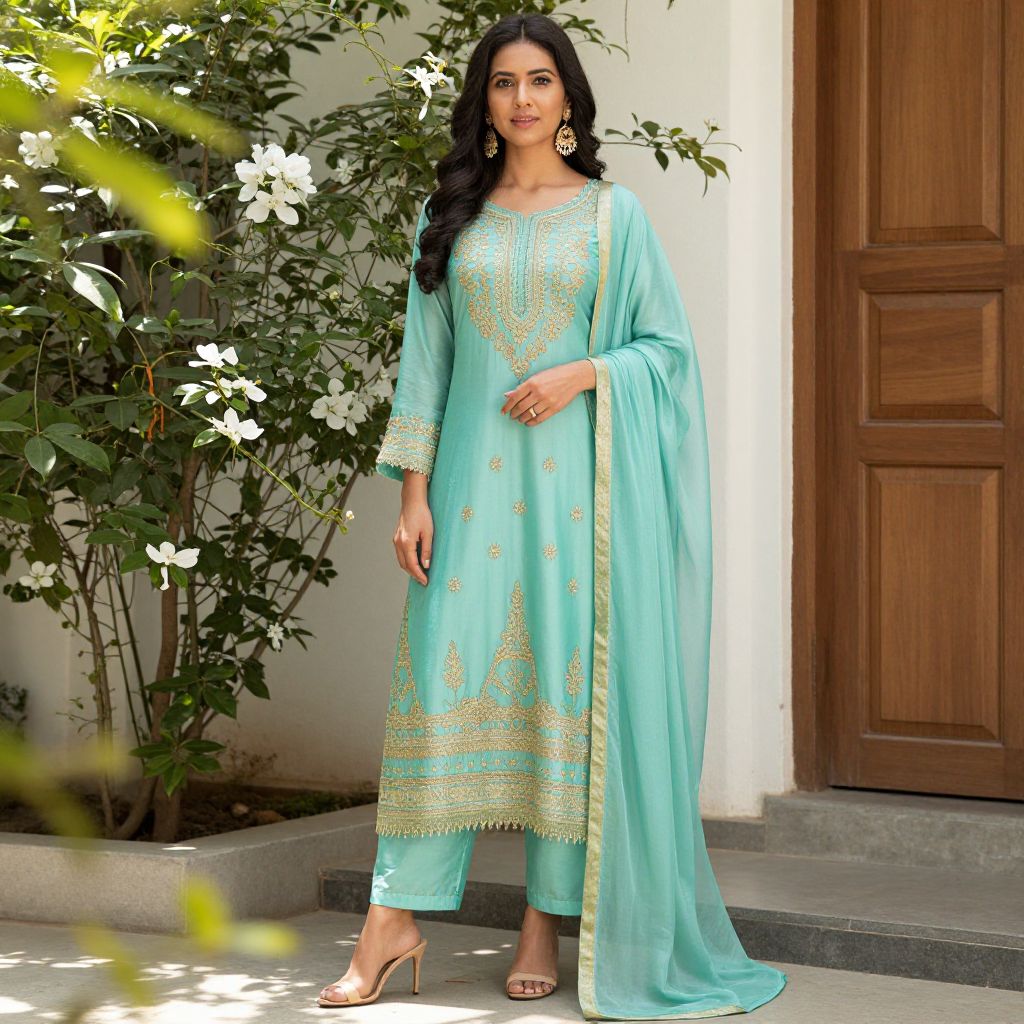 Photograph of a beautiful South Asian woman with medium brown skin and long black hair standing outdoors. She's wearing a light turquoise traditional salwar kameez with intricate gold embroidery, a matching long dupatta, and gold earrings. She's also wearing beige high-heeled sandals. The background features a white wall, wooden door, and lush greenery with white flowers. Sunlight filters through the leaves, casting soft shadows.