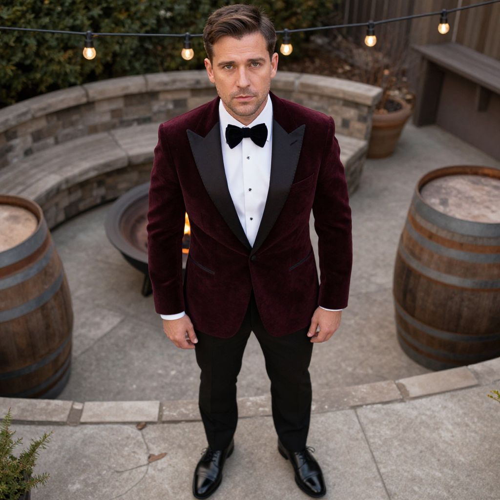 A man, burgundy peak lapel tuxedo, satin lapel, white dress shirt, black velvet bow tie, black leather monk strap shoes, tailored fit, rich velvet material, cozy outdoor patio, string lights overhead, fire pit surrounded by barrels, overhead shot, confident expression. Man has masculine face and piercing eyes