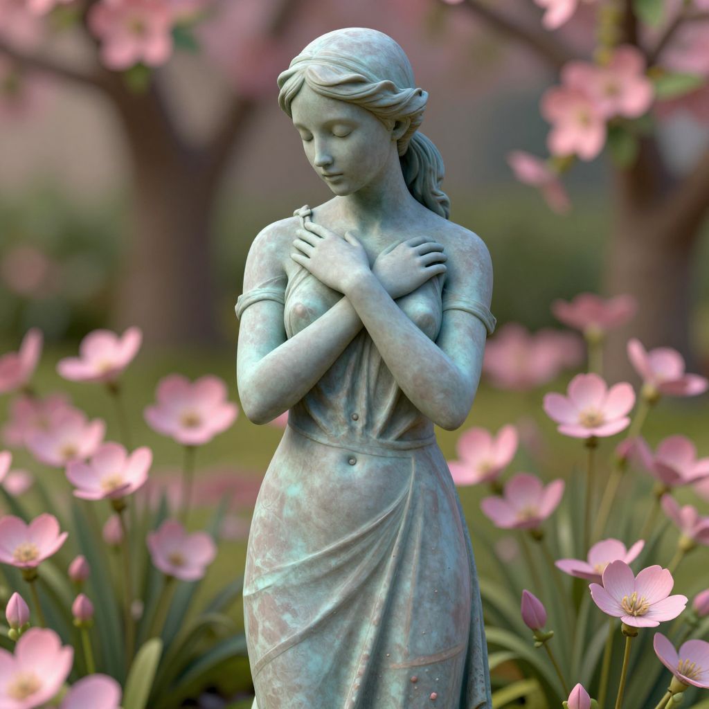 A serene 3D-rendered sculpture of a woman with a patina finish stands amidst a vibrant garden, where delicate pink flowers bloom around her, symbolizing the emotional depth and artistic expression captured in this digital artwork.