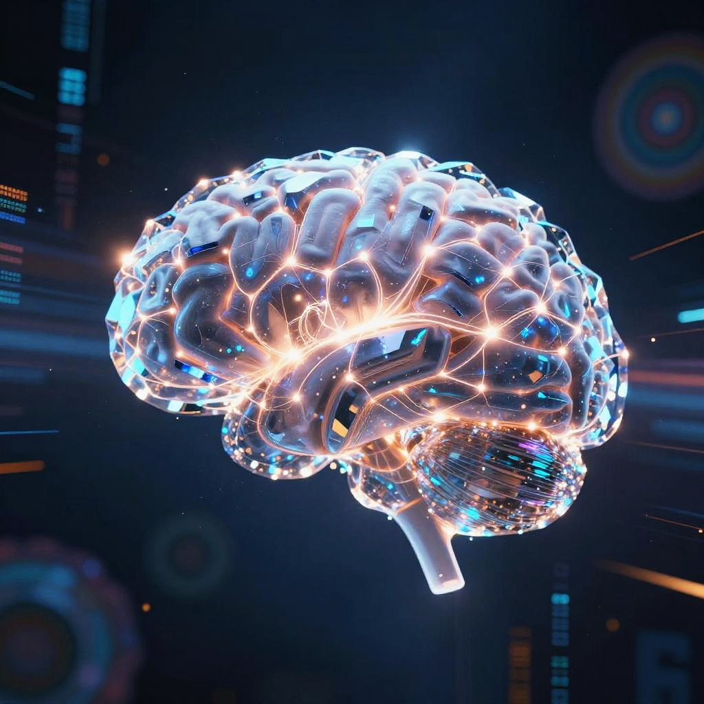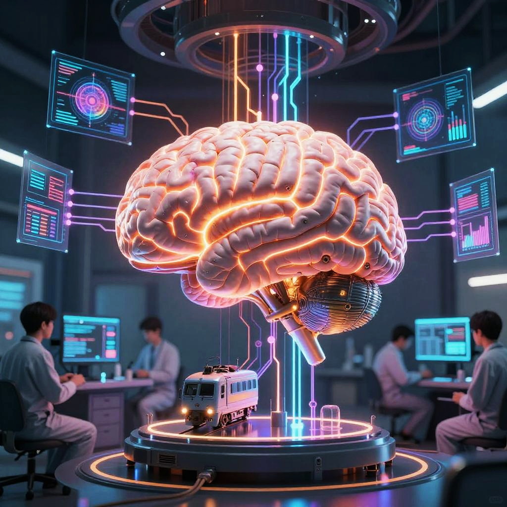 AI picture transformer concept art showing a large neural network interface transforming blurry images into hyper-detailed portraits with vivid colors, set in a high-tech laboratory filled with screens and holograms.