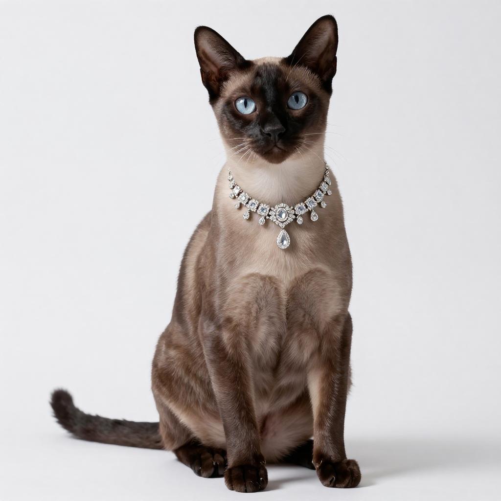 Studio portrait of a Thai Lilac cat with glossy dark fur and striking blue eyes, sitting upright. The cat is adorned with an ornate, sparkling diamond necklace, photographed against a clean white background. High-resolution, ultra-detailed image highlighting the luxury and elegance of the pet.