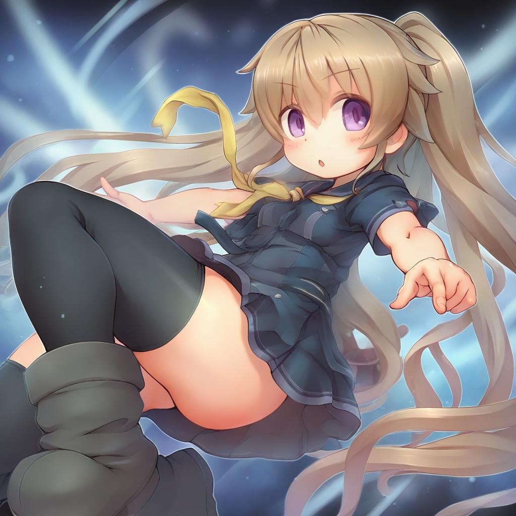Arisaka mashiro, ao no kanata no four rhythm, 1girl, purple eyes, pink eyes, hair between eyes, brown hair, very long hair, long hair, twintails, small breasts, ass, thighs, black thighhighs, by artist ubanis, leet