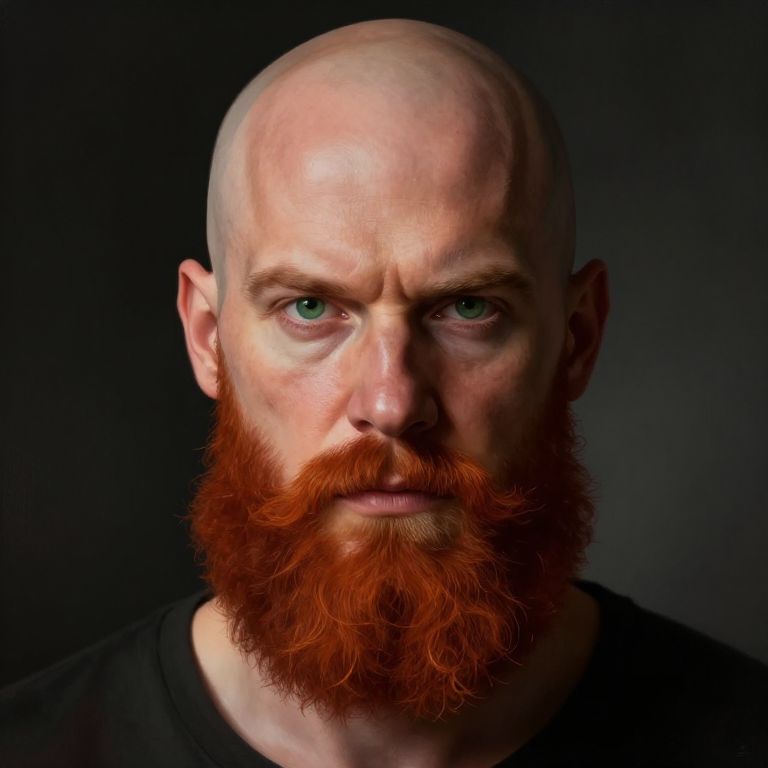A portrait of a bald ginger with beard, intense green eyes, illuminated by moody studio lighting, sharp contrast highlighting the texture of skin and fiery beard, hyper-realistic digital painting, subtle background with dark gradients, dramatic and powerful expression
