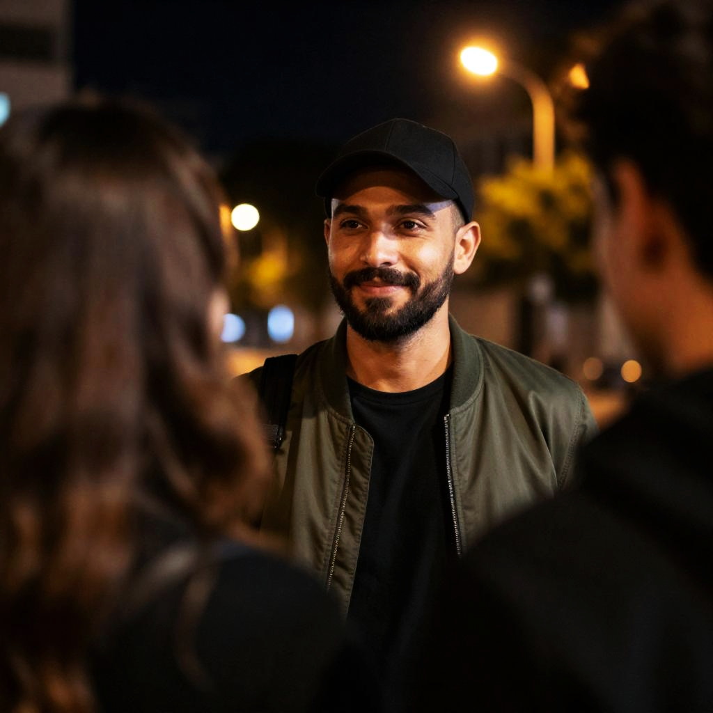 Photograph of a man with short dark hair and a beard, wearing a light gray shirt, leaning on a metal window frame, looking at his reflection. A bald man with a black vest and white shirt, seen from behind, holds a camera, taking a photo. The background is dark with reflections in the window.