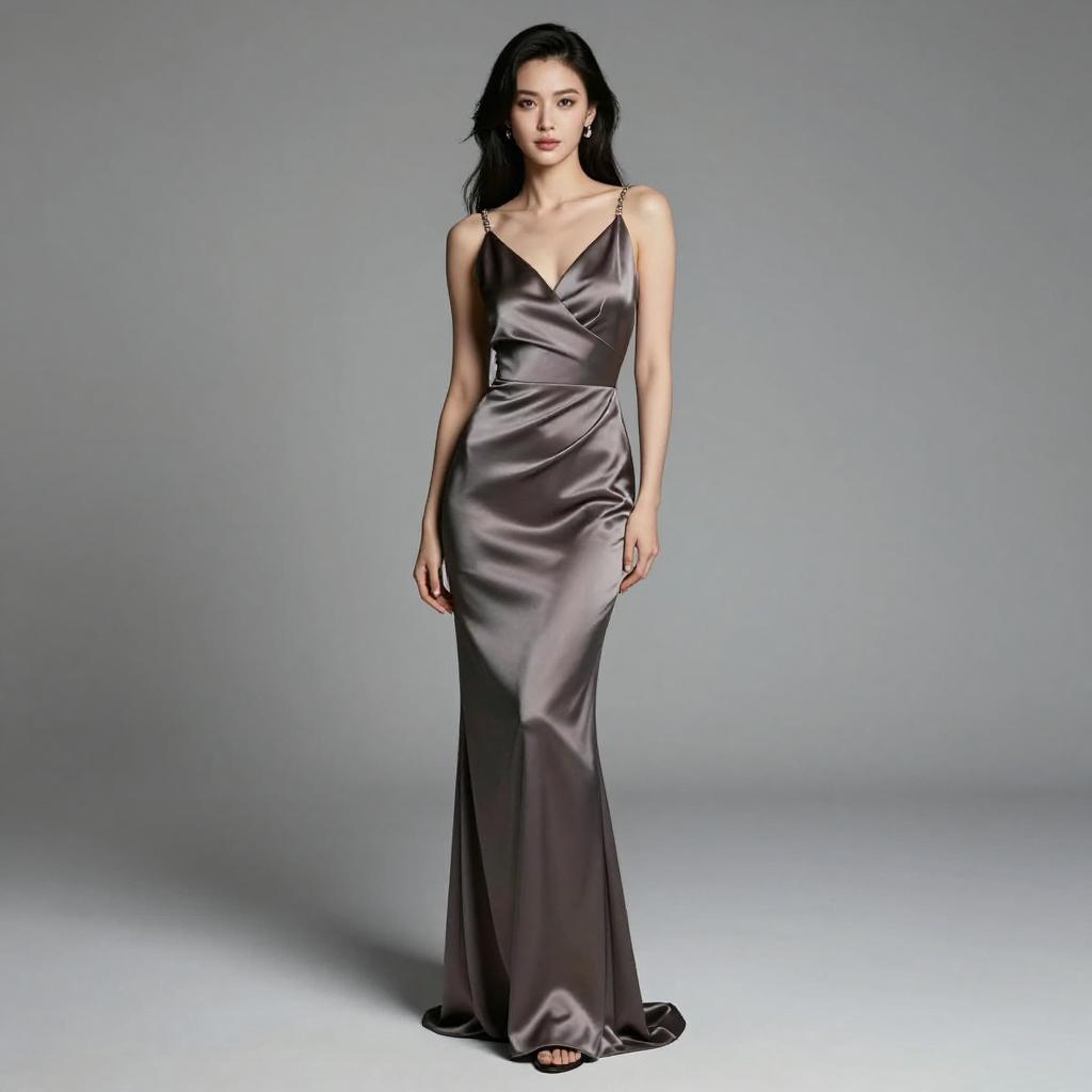 A woman stands elegantly in a sophisticated, silky evening gown, showcasing a glamorous and timeless fashion style. The lighting casts a subtle shadow, highlighting the gown's luxurious texture and the woman's poised presence. The image conveys a sense of classic elegance and refinement.