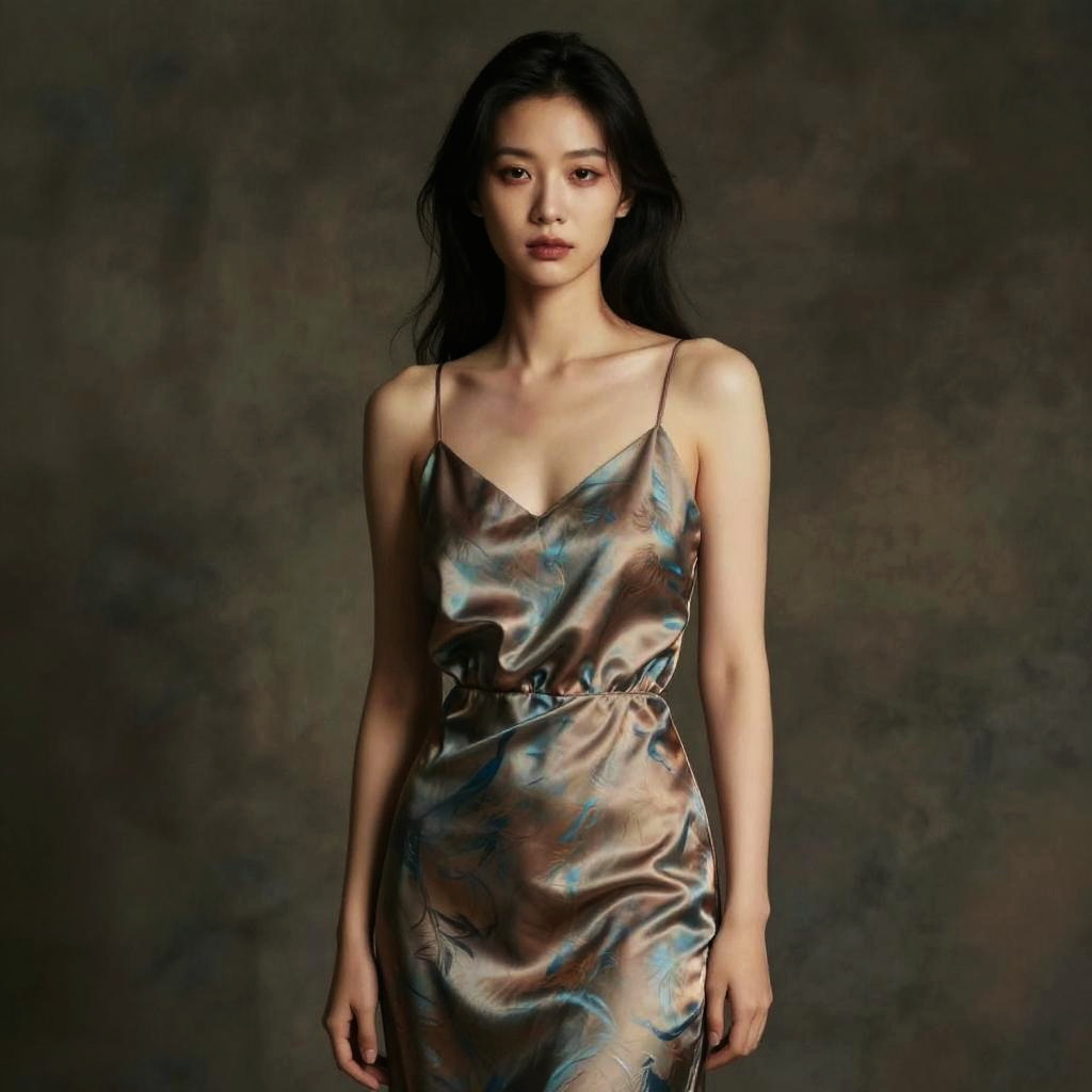 Photograph of an Asian woman with long, wavy black hair and fair skin standing against a dark, textured background. She is wearing a silky, form-fitting dress with thin straps and a plunging neckline, featuring a shimmering, iridescent pattern in shades of blue, silver, and gold. Her expression is neutral, and her makeup is minimal. The lighting highlights the sheen of the fabric, creating subtle reflections. The overall style is elegant and modern, with a focus on the dress's texture and color.