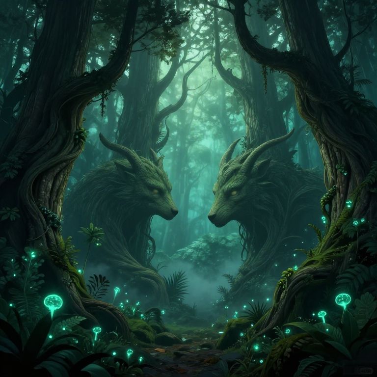 Digital fantasy artwork depicting a mystical forest with two large, horned, wolf-like creatures facing each other. The creatures have greenish fur and are surrounded by bioluminescent mushrooms emitting teal light. Dark, twisted trees frame the scene, with dense foliage and mist creating a mysterious atmosphere. The background fades into a luminous, ethereal green light, enhancing the magical ambiance. The forest floor is covered with moss and ferns, adding texture and depth. The creatures' detailed fur and the glowing mushrooms create a striking contrast in this otherworldly environment.