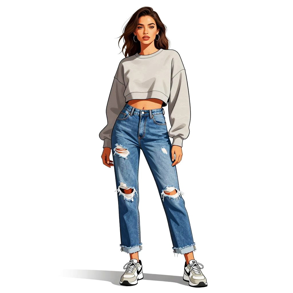 A stylish woman stands confidently in a full-body portrait rendered in a realistic comic art style. She wears a cropped sweatshirt and high-waisted, distressed jeans paired with sneakers, exuding a casual yet trendy vibe. The detailed illustration highlights both fashion and dynamic posture within a minimalistic background.