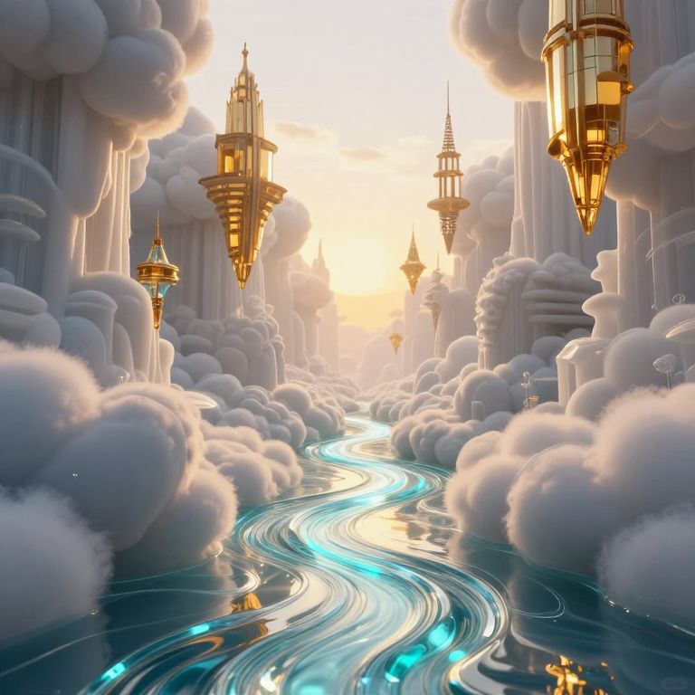 A surreal 3D-rendered landscape depicts a luminous river of molten glass flowing upward through a dreamlike corridor of towering, cloud-like formations, illuminated by golden-hour lighting that reflects impossible architectural wonders suspended in the ethereal sky.