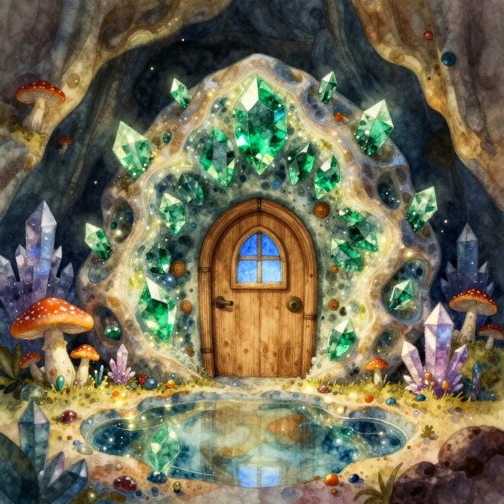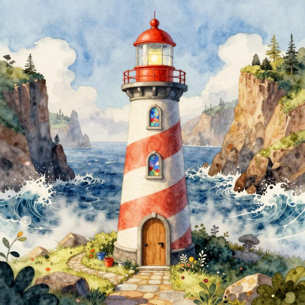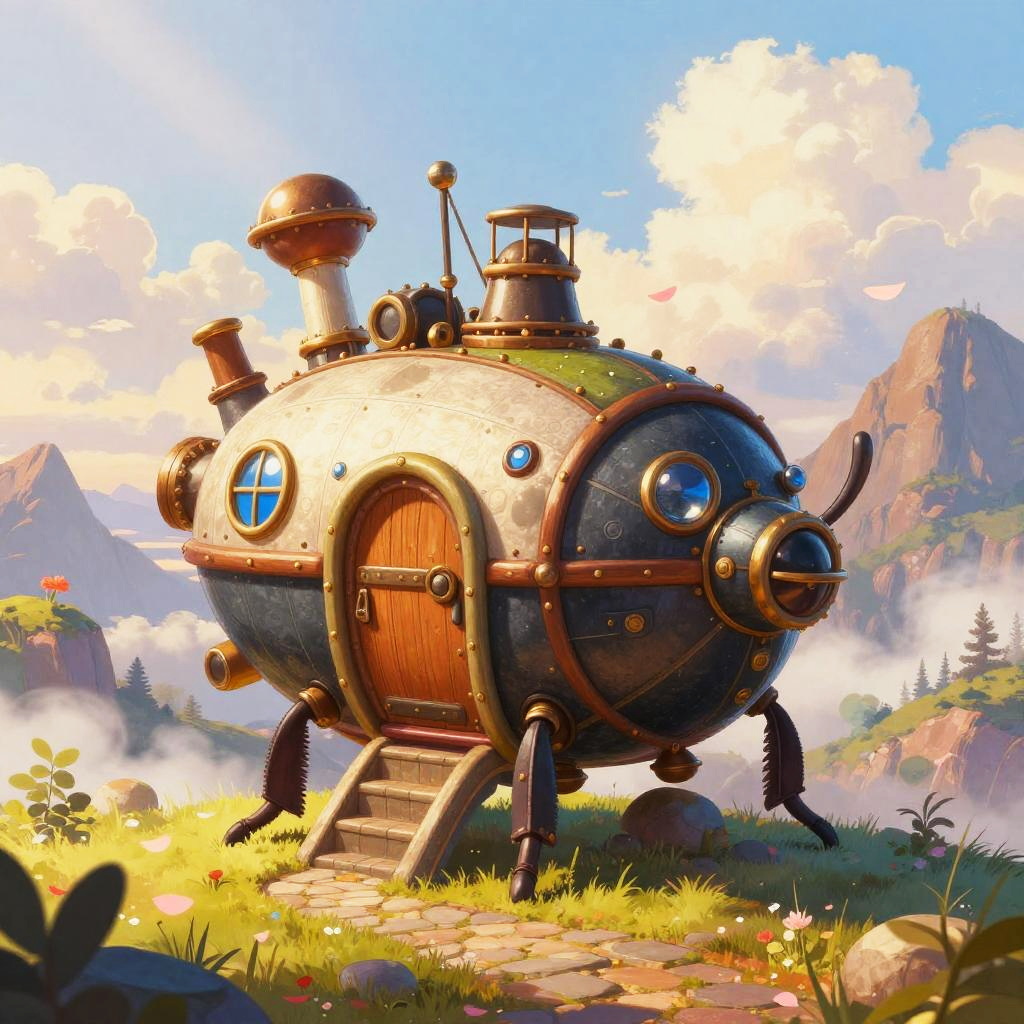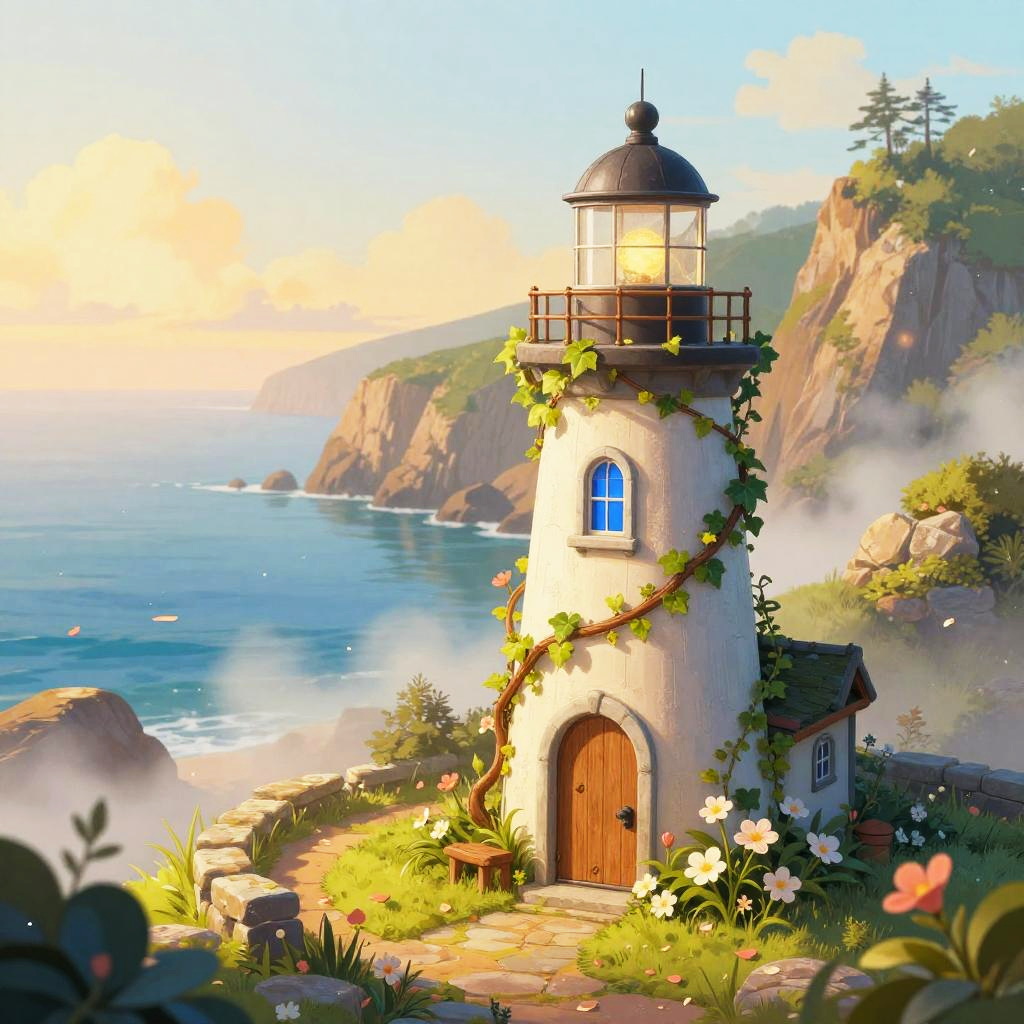 A colorful, magical illustration featuring whimsical teardrop-shaped cabin made from polished driftwood, with a wooden arched door and a small blue window. The world around it is rocky seaside cliffs under a pastel dawn sky with curling seaspray, sprinkled with charming details like winding stone paths, soft mist, and drifting petals. Rendered in stylized 3D render, with gentle, luminous lighting, saturated yet harmonious palette, high detail, soft textures, cozy and imaginative storybook mood, crisp focal point, and subtle depth of field.