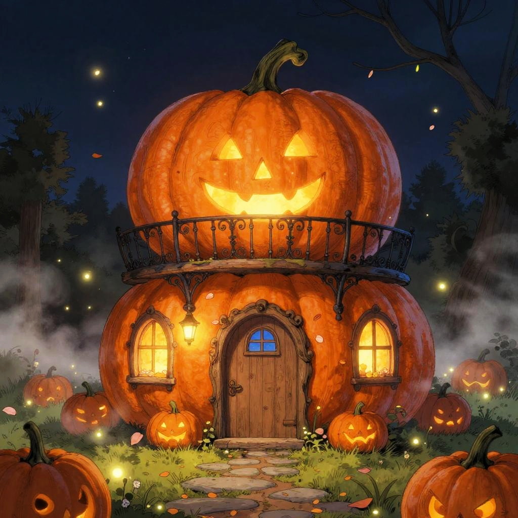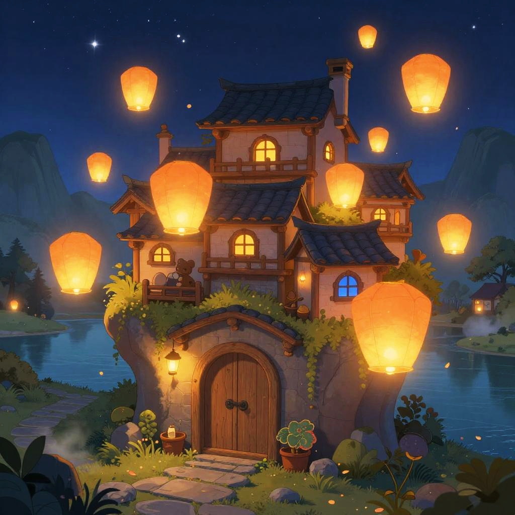 Whimsical wooden hobbit house with blue windows on rocky coastal path, surrounded by flowers and ocean waves at sunset. Digital art.