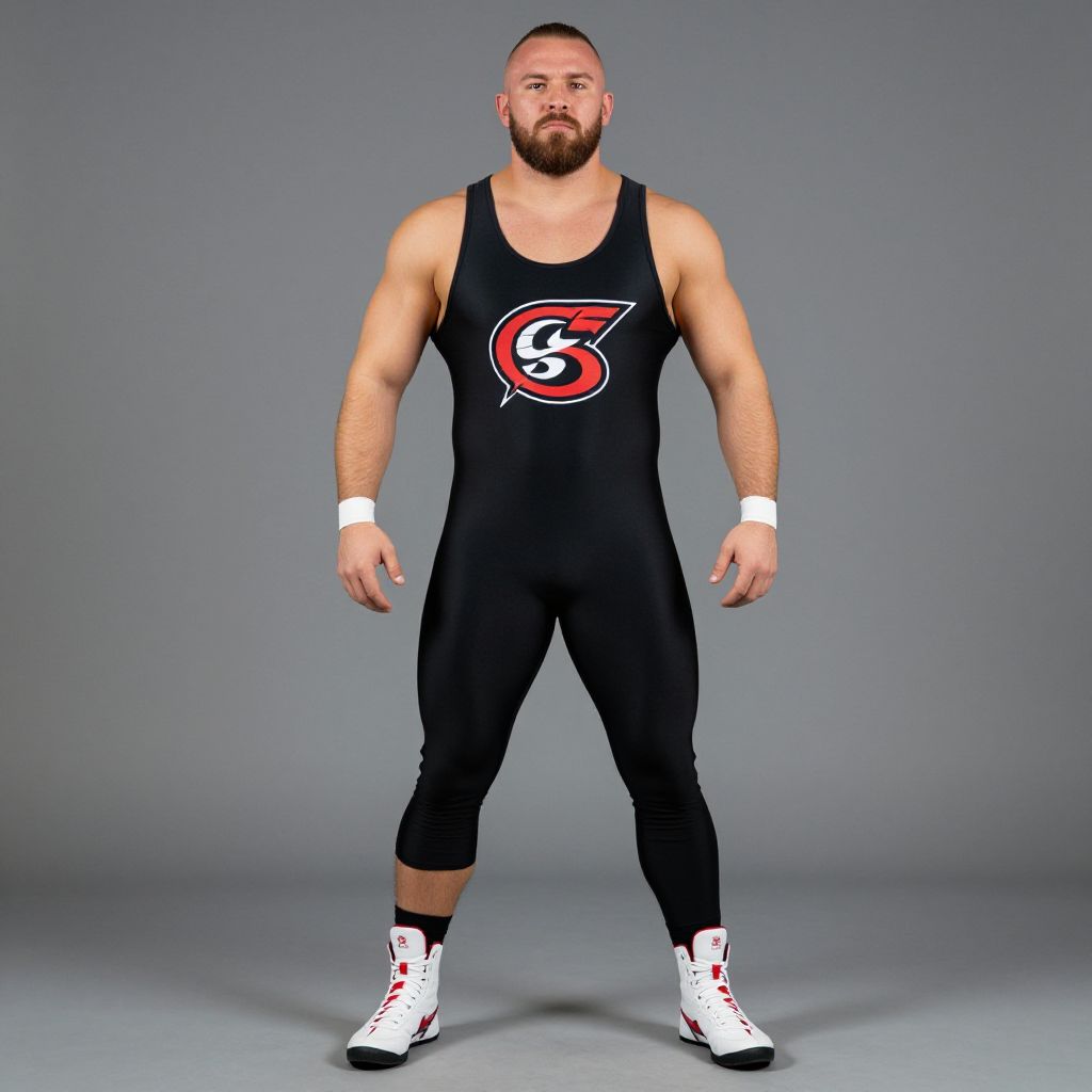 Man wearing a black wrestling outfit with a red and white logo on the front. He has a beard and is wearing white sneakers with red and black accents.