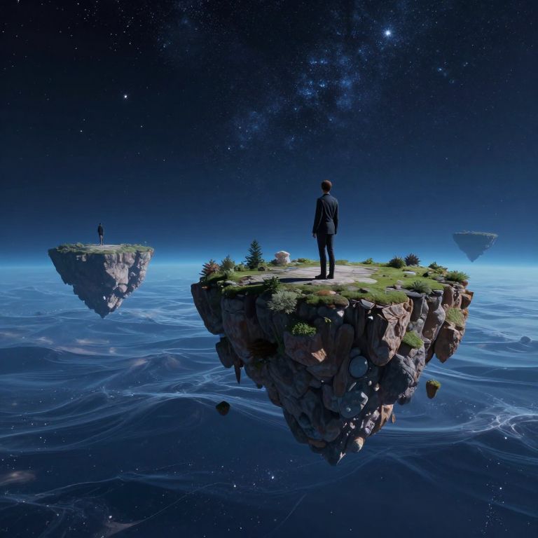 Digital artwork of a man in a black suit standing on a floating rock island, gazing at a starry, cosmic ocean with two other floating islands