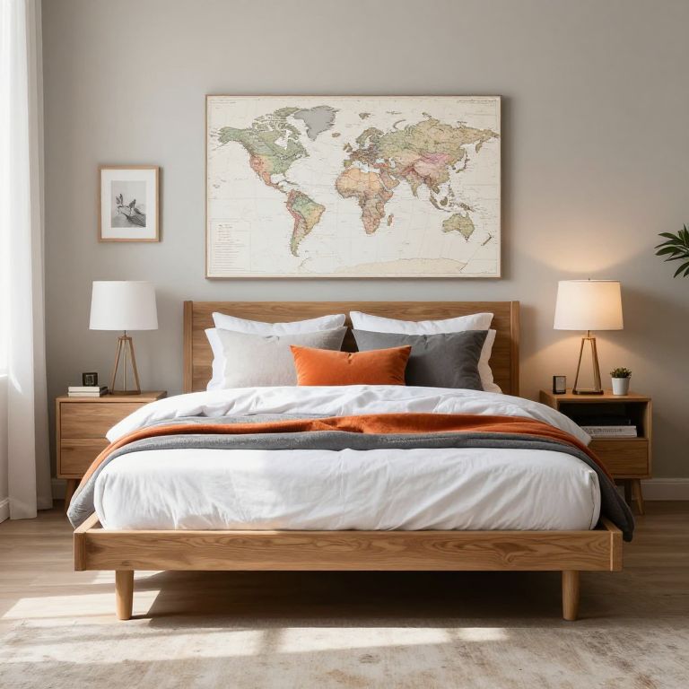 Cozy bedroom featuring a wooden platform bed with layered bedding in white, gray, and orange, flanked by two nightstands with lamps and books, complemented by a world map canvas above and framed artwork to the left, all set against neutral walls with natural light streaming through a window.