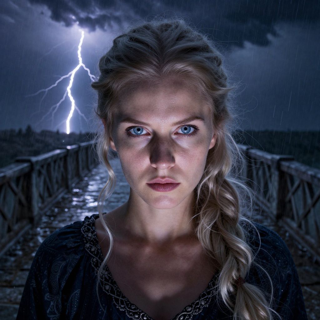 Photograph of a blonde woman with intense blue eyes, braided hair, dark medieval dress, under a stormy night sky with lightning.
