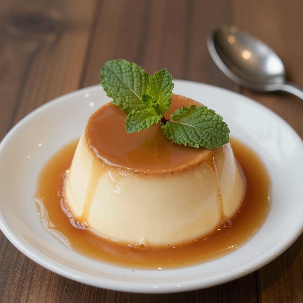 A close-up of a creamy caramel flan dessert garnished with fresh green mint leaves on a white plate, rich caramel sauce dripping down the sides, placed on a dark wooden table with a silver spoon nearby, high detail, food photography lighting