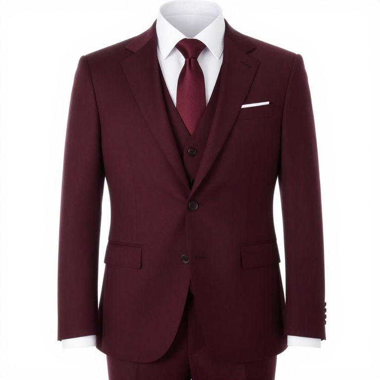 Burgundy formal men's suit featuring a three-piece ensemble with a slim-fit blazer, peaked lapel, matching vest, and trousers, complemented by a crisp white shirt, burgundy tie, and pocket square, presented against a clean white background.