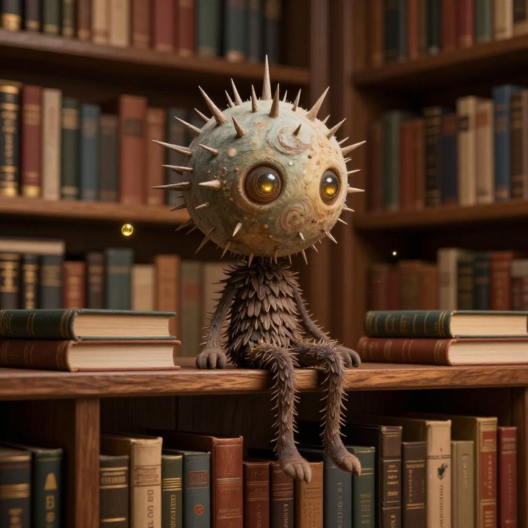 A whimsical figure with a spherical head adorned with numerous spiky protrusions and glowing eyes sits serenely atop a wooden bookshelf, surrounded by an endless library of books, as tiny golden orbs float mysteriously around its form.