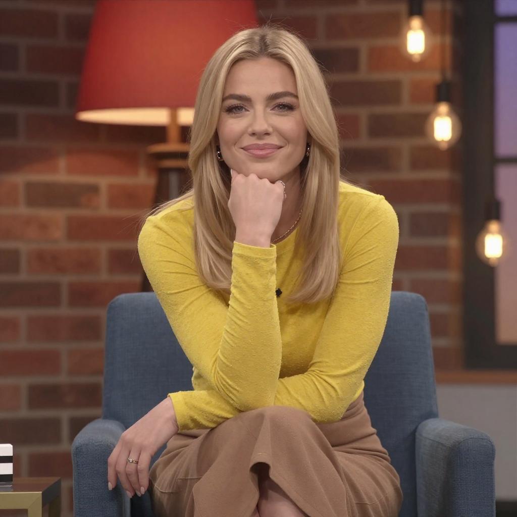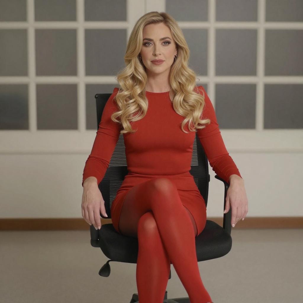 Photograph of a blonde woman with long, wavy hair, sitting confidently on a black office chair. She wears a vibrant red, long-sleeved dress and matching red tights with red high-heeled shoes. Her hands rest on her thighs, and she gazes directly at the camera. The background features a patterned wall with a grid of square windows.