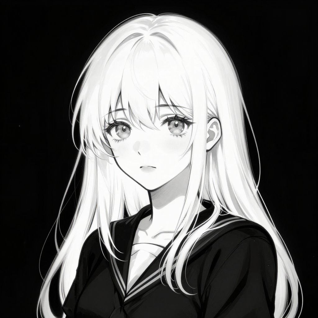 Digital portrait of a woman with glowing neon blue, pink, and white hair against a black background, showcasing vibrant neon highlights on her face.
