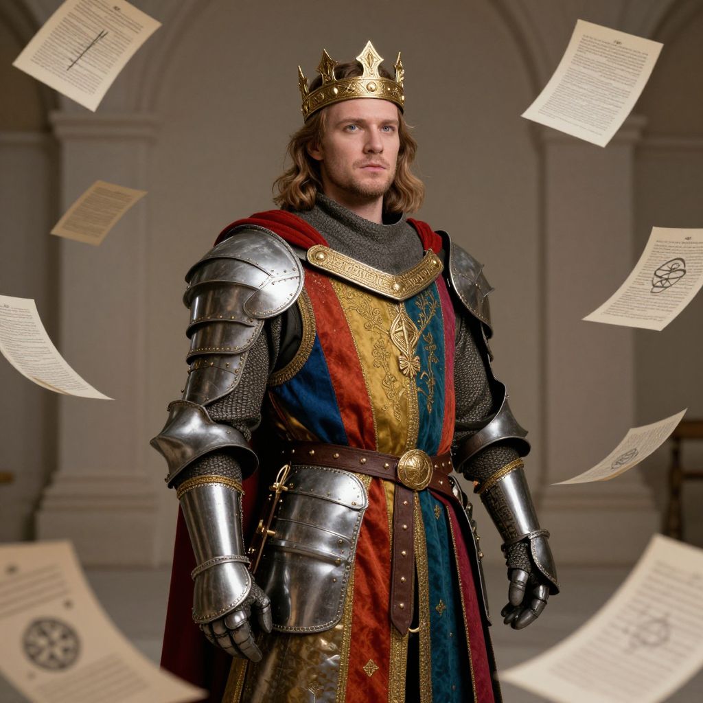 A man in ornate, colorful armor and a crown stands proudly, surrounded by floating papers and symbols, evoking a medieval or fantasy setting.