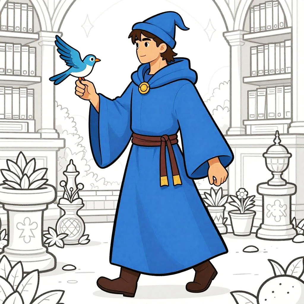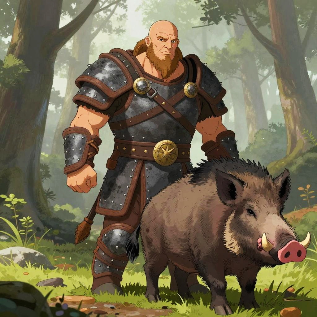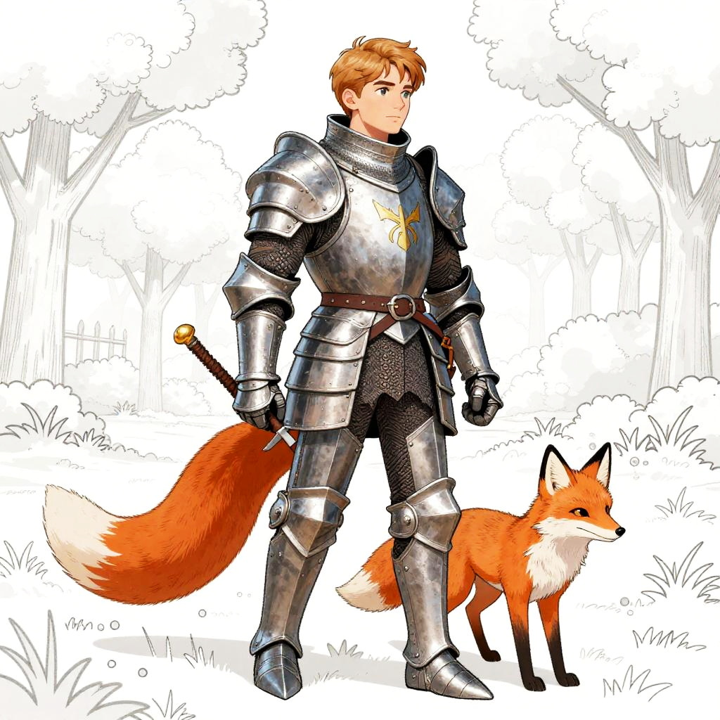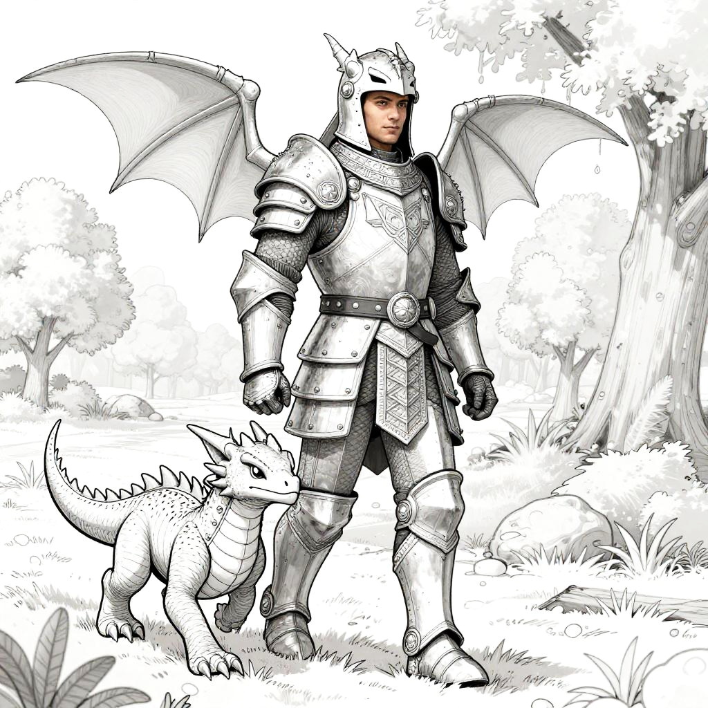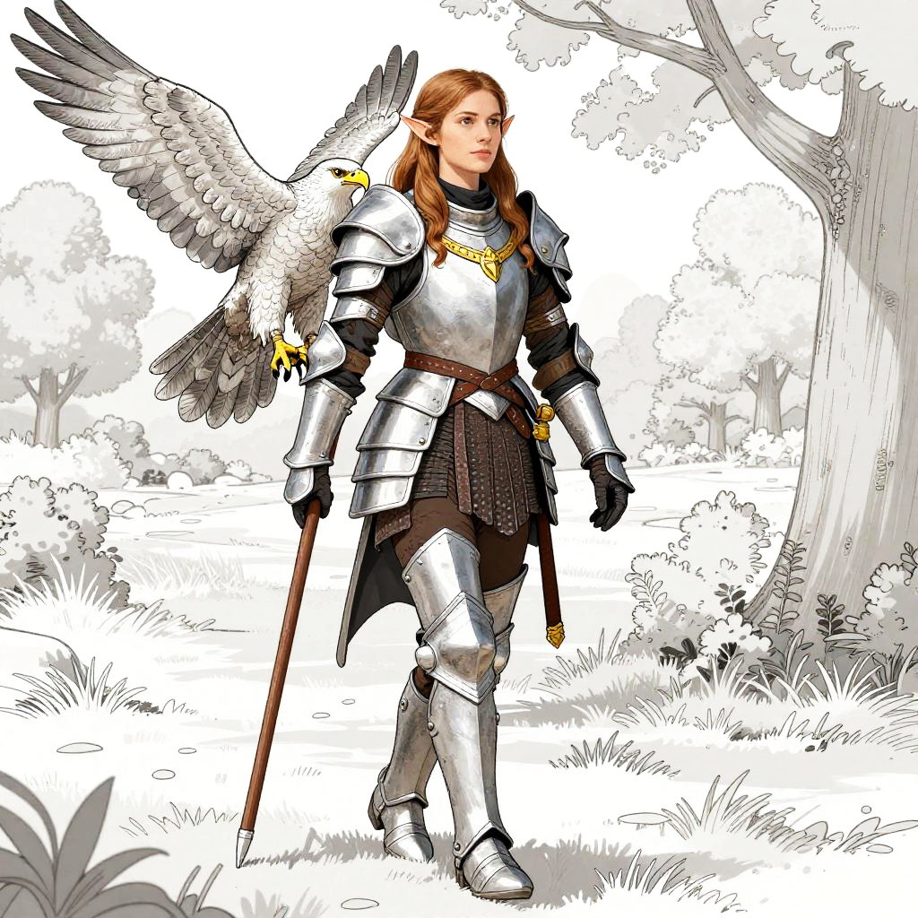 Forest dryad guardian wearing natural bark armor, taking a stag on a walk through a park. Coloring page style with thick lines, low detail, and no shading. Fantasy setting with a realistic face and vivid colors, inspired by D&D character design.