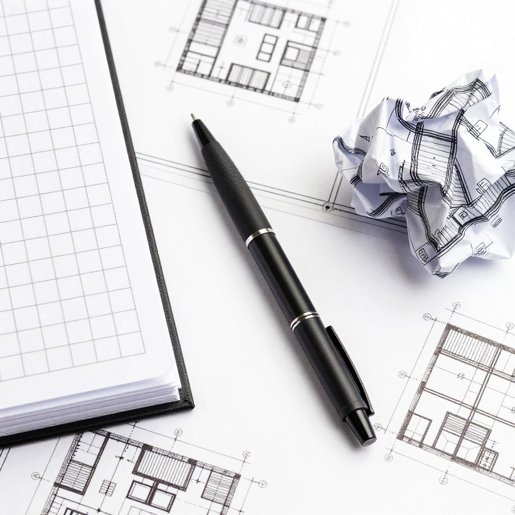 This is a digital drawing of a cluttered desk with architectural blueprints scattered across it. There's a black pen angled diagonally across the center, a white binder with a black grid pattern on the left, and a crumpled blueprint on the right. The background is a stark white, making the black and gray lines of the blueprints and pen stand out sharply.