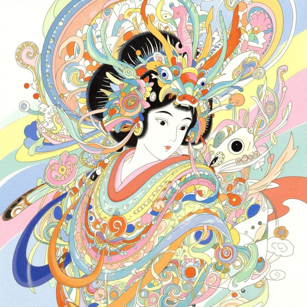 The image is a vibrant, intricate piece of Japanese tribal art, rendered in a bright, pastel color palette that evokes a sense of whimsy and fantasy. The composition is densely packed with ornamental elements, featuring swirling patterns, floral motifs, and fantastical creatures. The central figure, a woman with a serene expression, is adorned with elaborate headdress decorations that resemble mythical creatures and intricate designs. The headdress is composed of various shapes and textures, including smooth, flowing lines and more rugged, organic forms. The background is a mix of soft, blended colors, creating a dreamlike atmosphere that complements the overall aesthetic. The art style is reminiscent of anime manga, with its bold lines and dynamic, flowing forms. The influence of Studio Ghibli and Hayao Miyazaki is evident in the imaginative and fantastical elements, while the style of Akira Toriyama adds a sense of energy and movement to the composition. The interplay of colors, textures, and shapes creates a visually rich and complex scene that invites the viewer to explore and discover new details upon closer inspection.