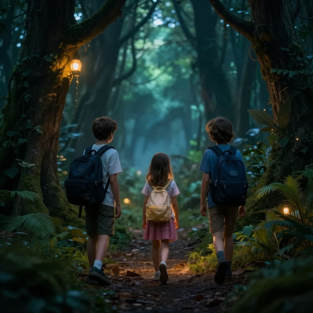 Photograph of a young girl with light brown hair in a ponytail, wearing a white blouse and dark brown pinafore dress, standing on a dirt path in a dense forest. She is facing away, walking towards the blurred, sunlit background. The forest is lush with tall trees, green ferns, and moss-covered ground, creating a serene, natural atmosphere. The lighting is soft, with dappled sunlight filtering through the trees, highlighting the girl's silhouette and the path's texture. The image evokes a sense of adventure and tranquility in nature.