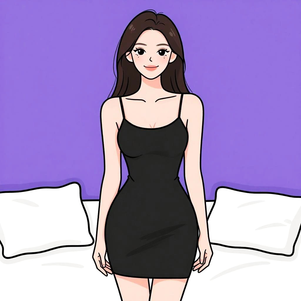 Woman with pretty face and pretty hair. smiling Woman, minimalist, black bodycon mini dress, thin spaghetti straps, low scoop neckline, fitted silhouette, plain fabric, simple design, bedroom background with white bed linen. --sref 1461