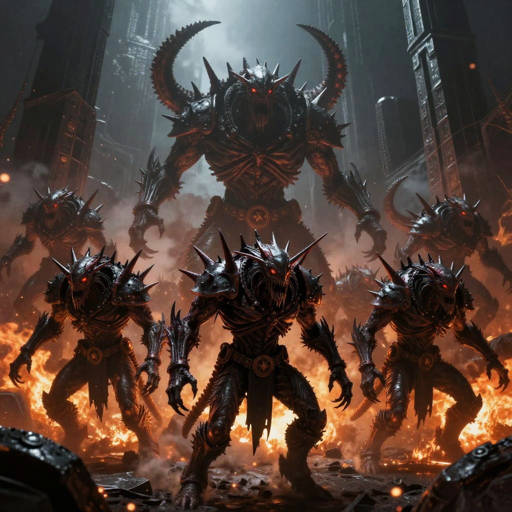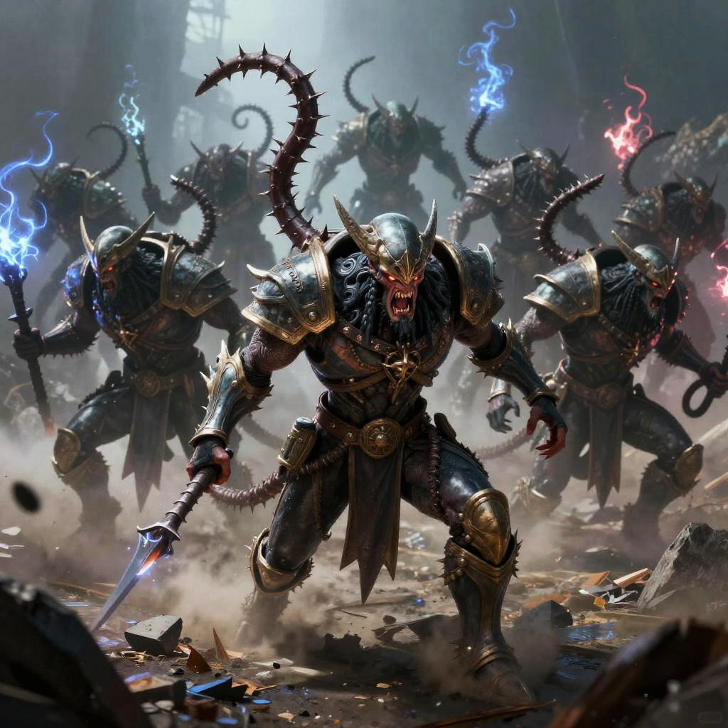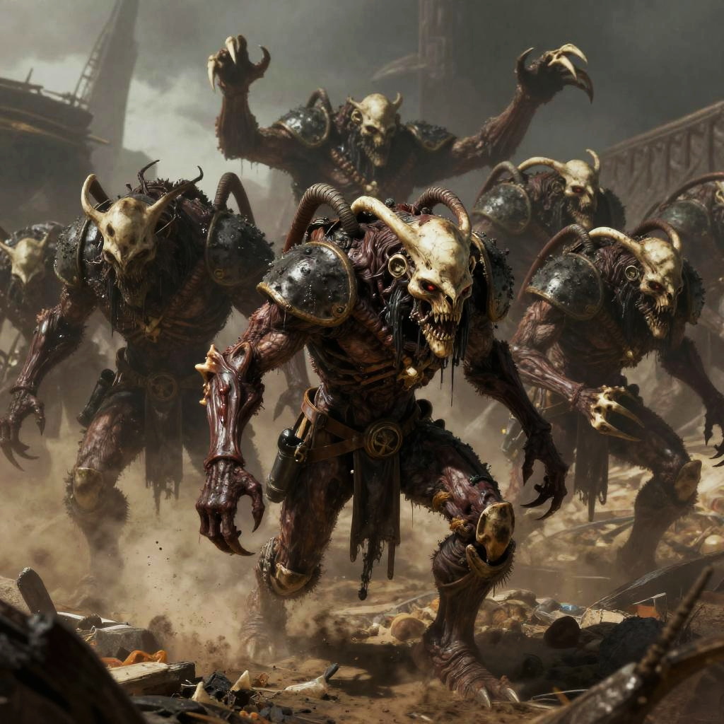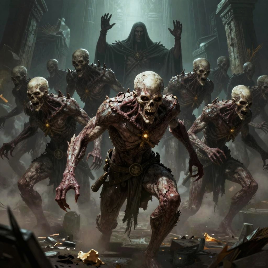 Cinematic illustration of a Chaos Daemon horde, with cracked skin, glowing bone fragments, led by a cunning Keeper of Secrets, charging through a desecrated tomb.