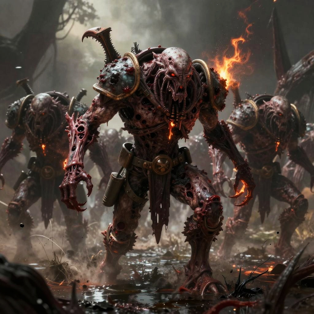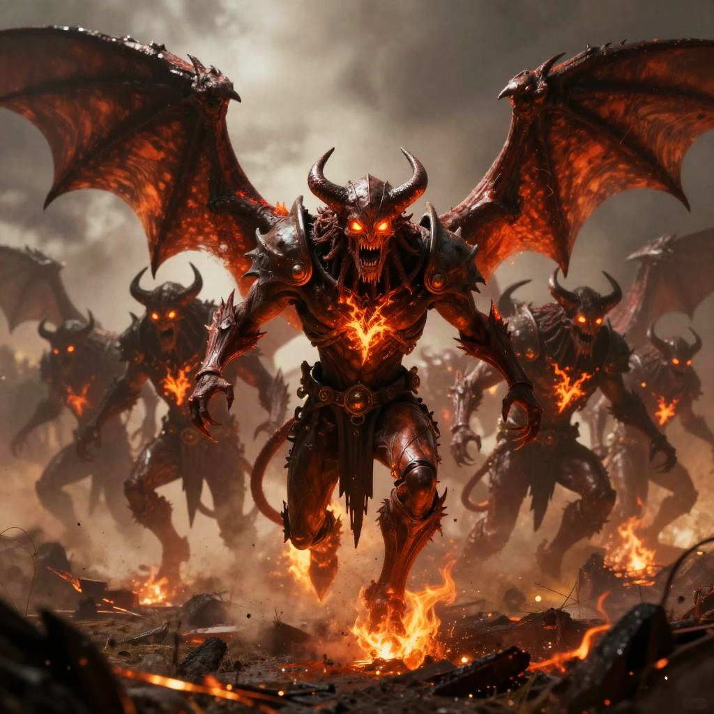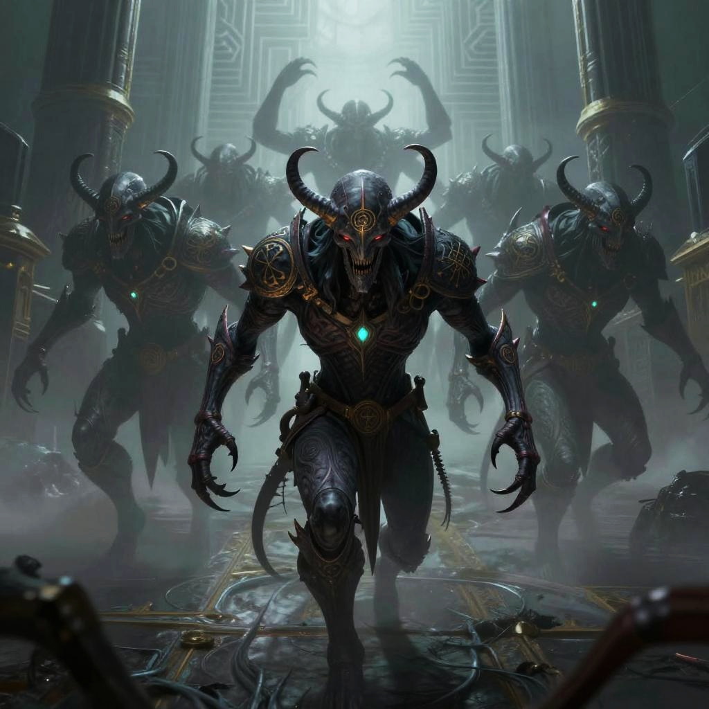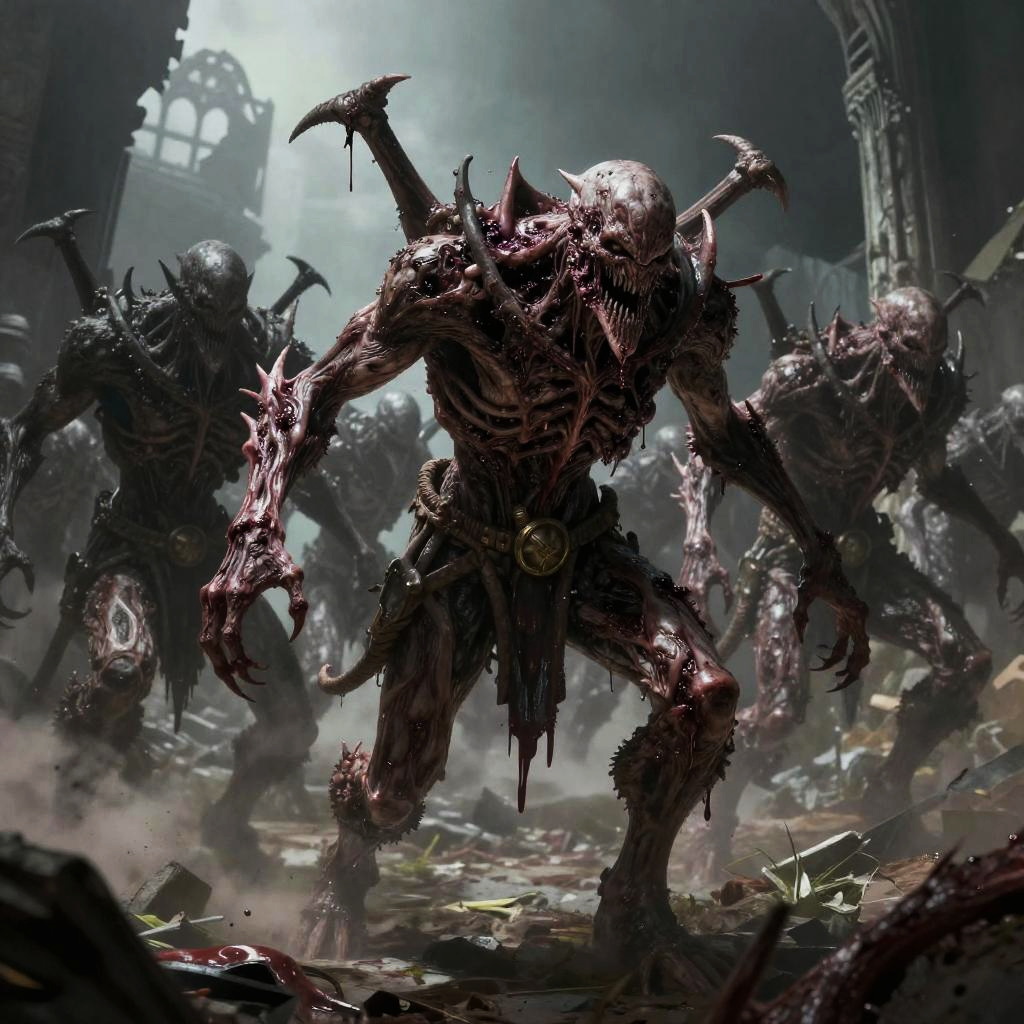 Cinematic illustration of a Chaos Daemon horde, with cracked skin, glowing bone fragments, led by a cunning Keeper of Secrets, charging through a desecrated tomb.