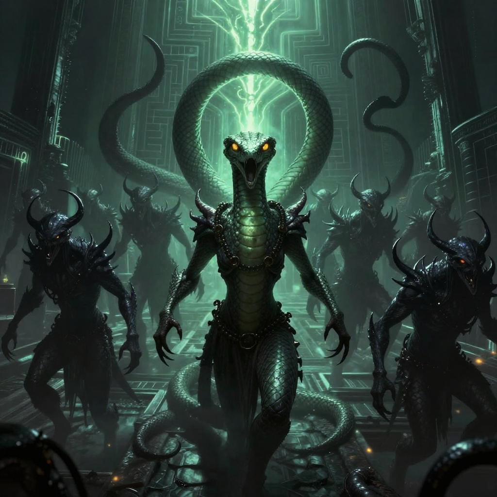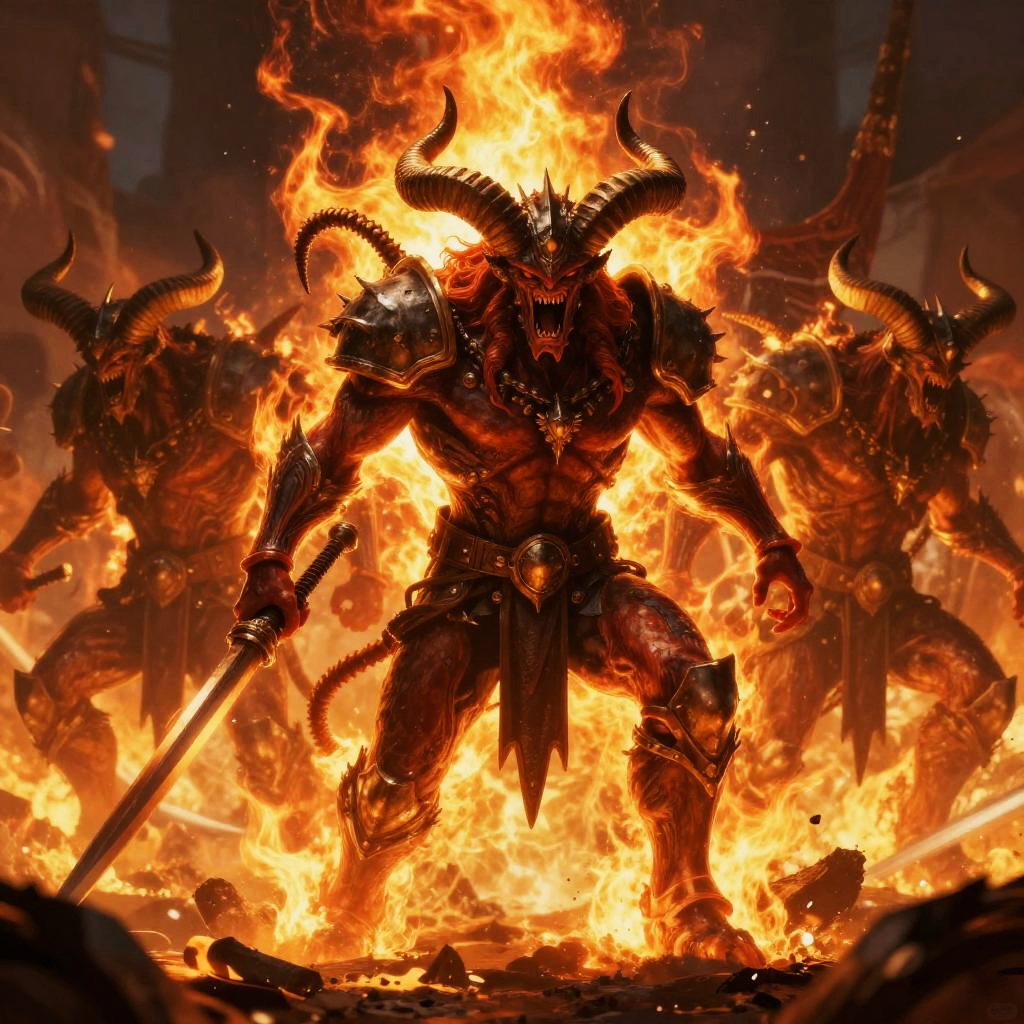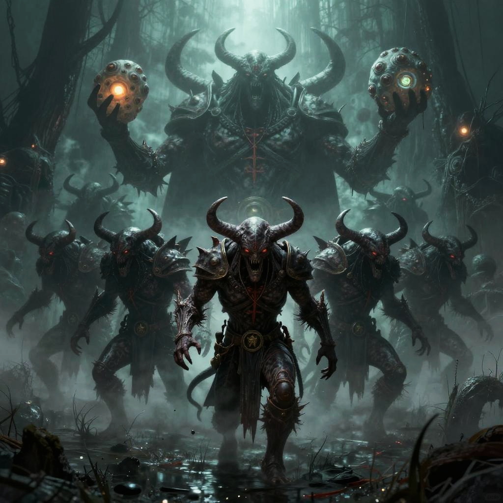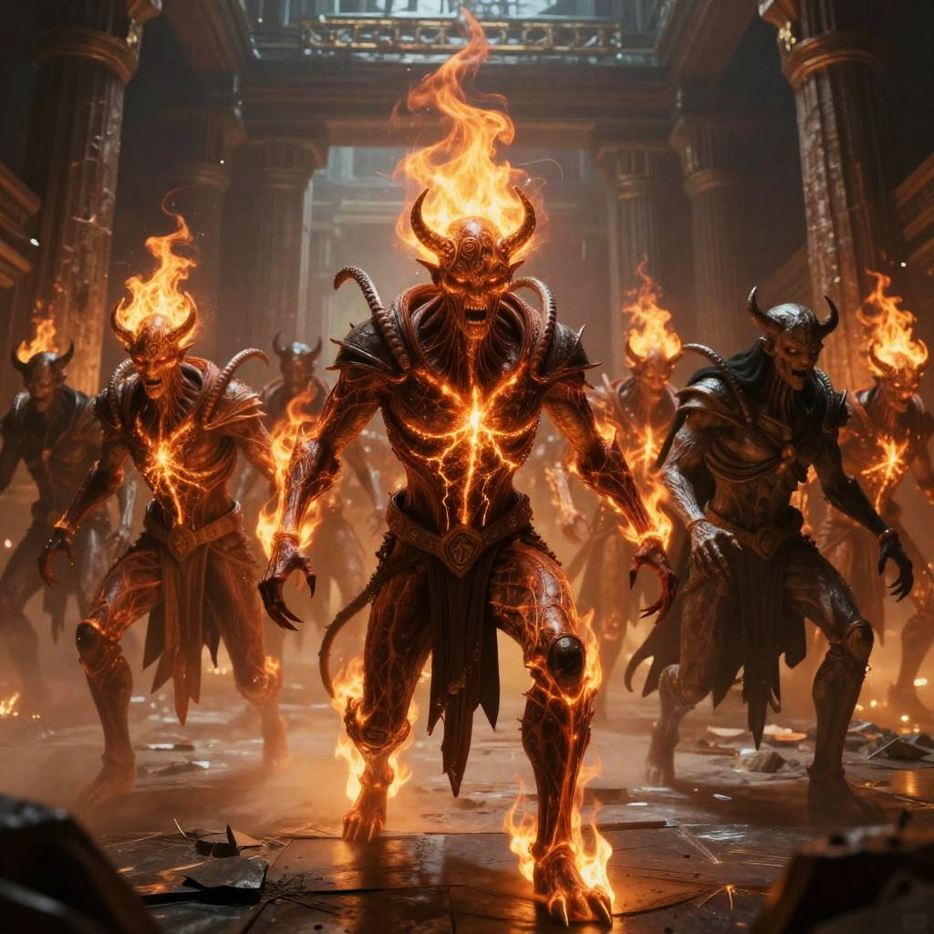 Cinematic illustration of a Chaos Daemon horde, with cracked skin, glowing bone fragments, led by a cunning Keeper of Secrets, charging through a desecrated tomb.
