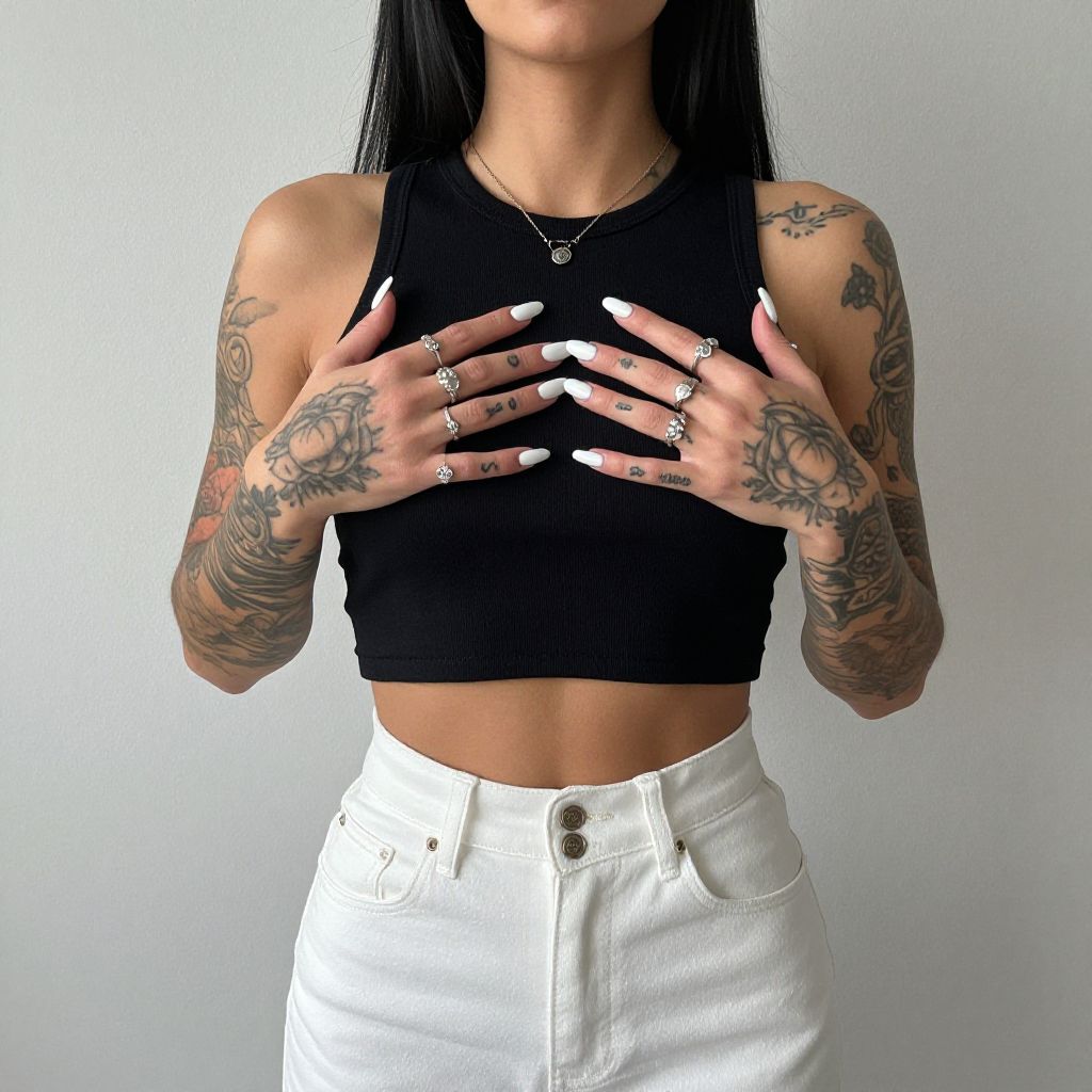 Photograph of a woman with long black hair, visible from the neck down, standing against a plain white background. She wears a black, sleeveless, ribbed crop top and high-waisted, white denim shorts with button details. Her hands, adorned with multiple tattoos including a large eye design on her right forearm and intricate patterns on her left forearm and fingers, are positioned in front of her chest. She has long, white, pointed nails and wears several rings on her fingers, along with a delicate necklace. Her skin is tan, and she has multiple tattoos on her arms and shoulders.