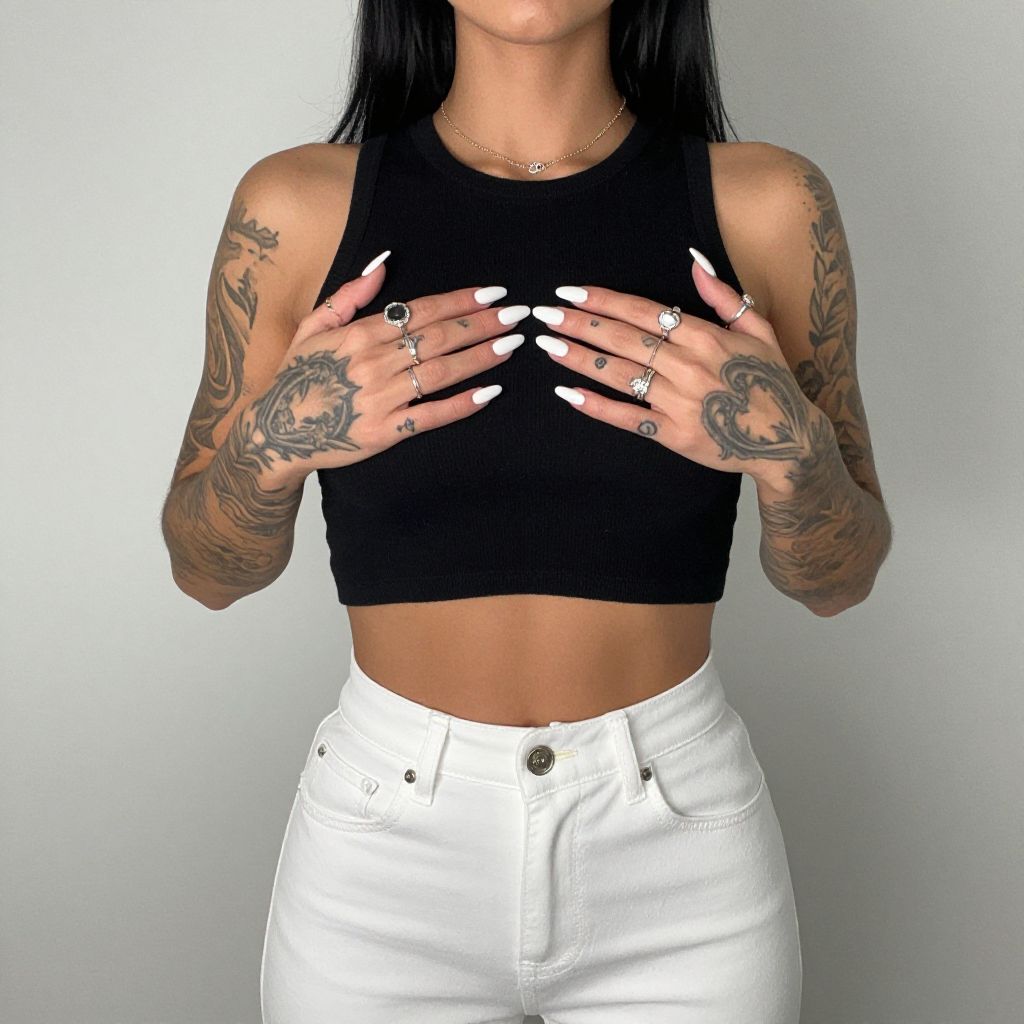 Photograph of a tattooed woman with long black hair, wearing a black sleeveless crop top and white high-waisted pants. She's holding her chest with both hands, showing off intricate tattoos on her arms and hands, and sporting long white nails and multiple rings. She's also wearing a delicate necklace. The background is a plain, light gray wall.