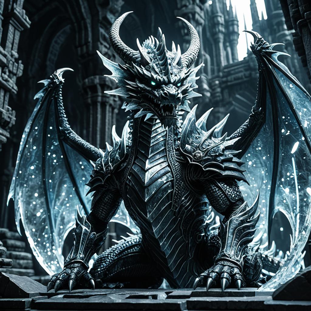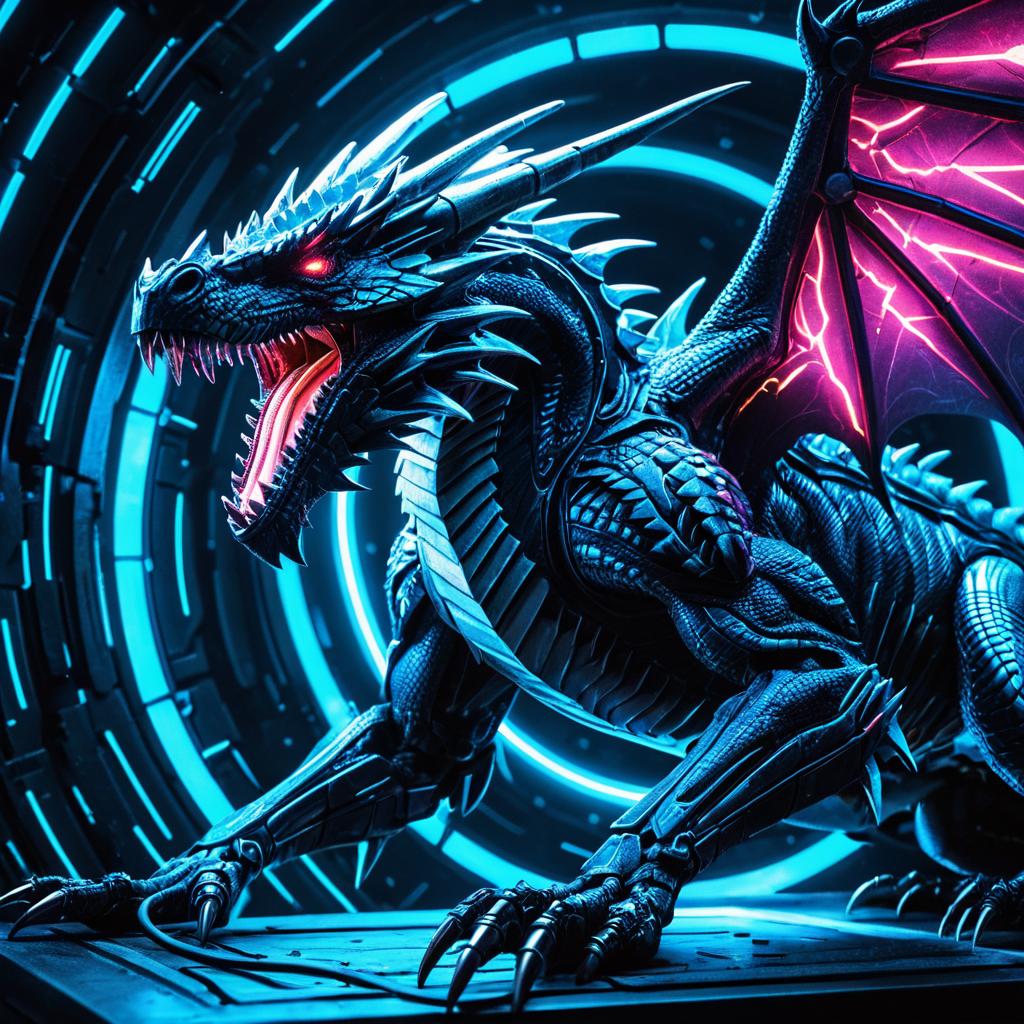 Create concept art for a creature called 'Ironclad Drake' in a sci-fi fantasy style. The building should showcase mechanical, draconic and dark bioluminescent influences while maintaining a cohesive game world.